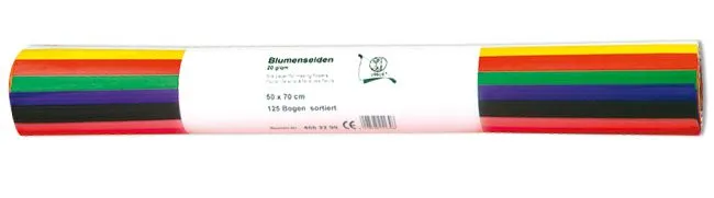 Die 125 Bogen des Sets, die alle die Maße 50 Zentimeter Breite und 70 Zentimeter Länge haben, sind in aufgerolltem Zustand lieferbar. Daher nehmen sie im Schrank des Klassenraums oder der Kindergartengruppe kaum Platz ein. Die Blumenseide mit der Stärke 20 Gramm pro Quadratmeter lässt sich Bogen für Bogen zu kleinen Kunstwerken verarbeiten. Allerdings ist das extrem dünne Papier nicht nassfest. Zudem sind Abfärbungen möglich.