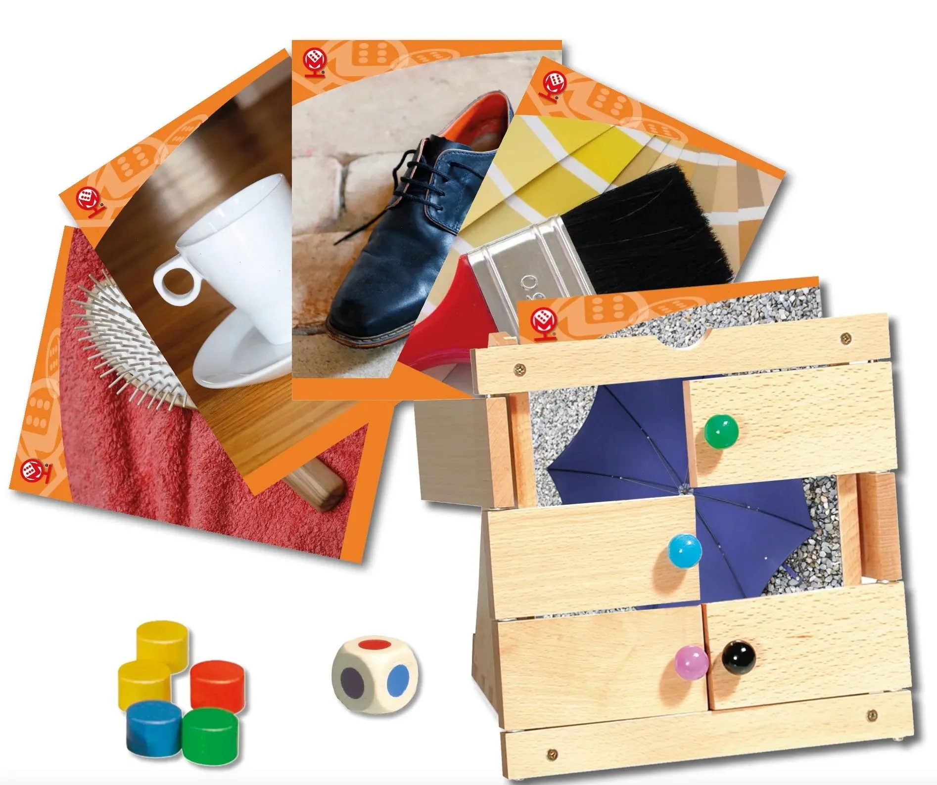 Für einen möglichst langen Spielspaß sorgen 39 Fotokarten mit 78 Bildmotiven aus der Kategorie "Alltagsgegenstände". Hinter dem Rahmen aus Buchenholz verbergen sich verschiedenste Motive aus dem Alltag. Das Ratespiel besteht außerdem aus einem Farbwürfel, 20 Spielsteinen sowie einem Gestell aus Buchenholz.