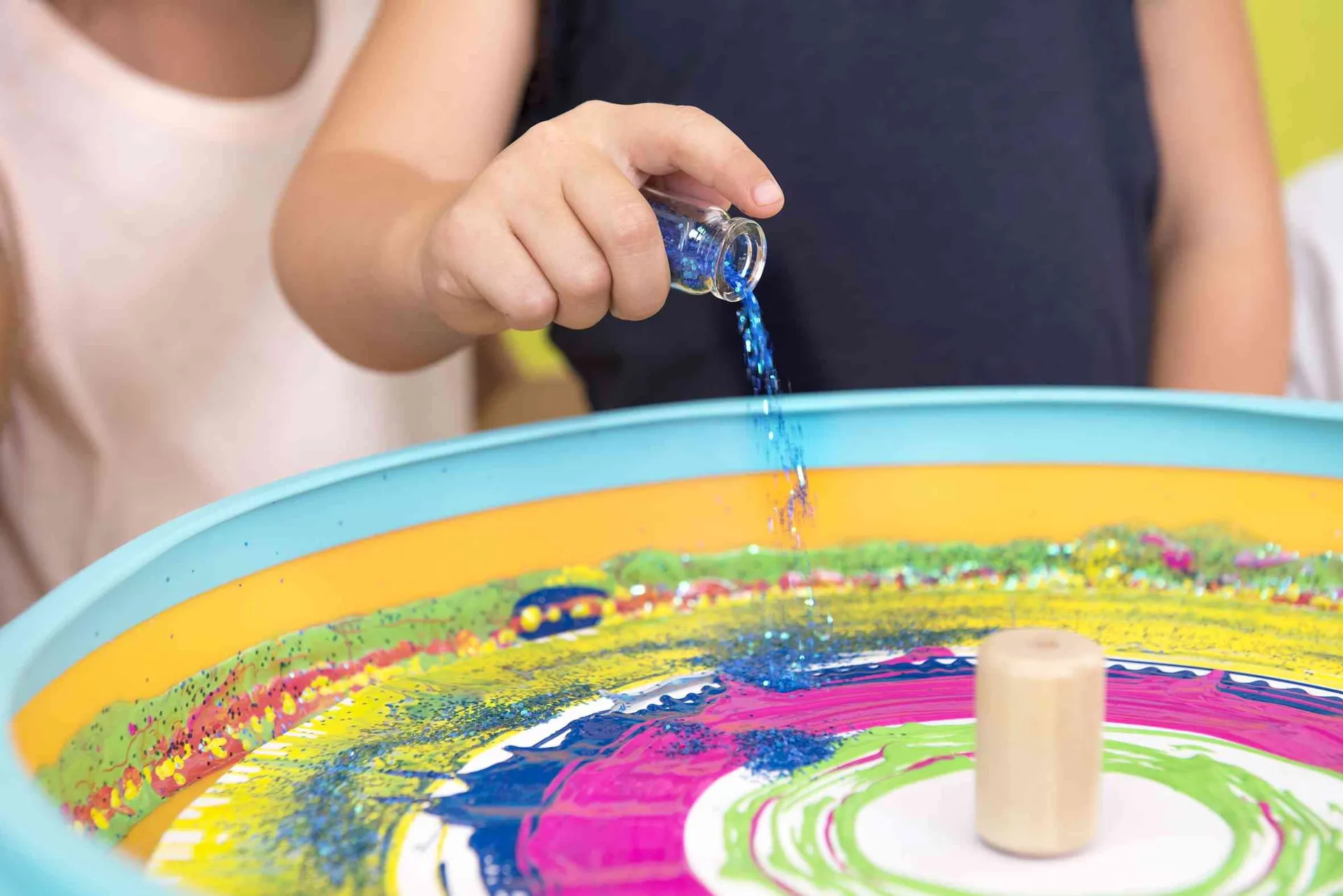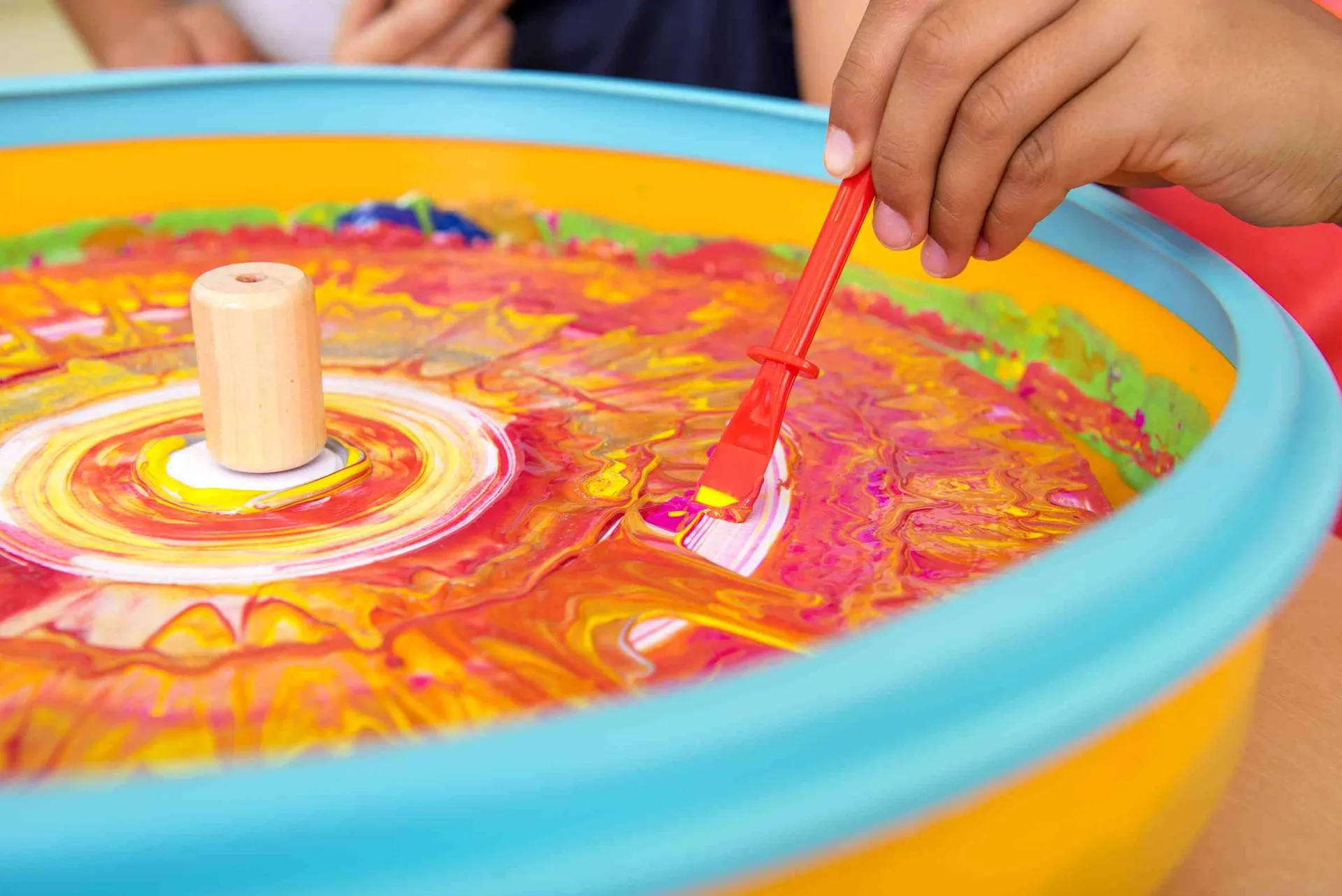 Die Farbenschleuder eignet sich für Kinder ab dem Kindergartenalter. Sie ist ideal für Kindergarten und Grundschule, da sie die Kreativität fördert. Die Kleinen lernen darüber hinaus erste physikalische Prinzipien wie die Fliehkraft spielerisch kennen. Es lässt sich mit der Farbenschleuder gut zusammenarbeiten, da ein Kind die Farbe auftragen und das andere kurbeln und zuschauen kann.