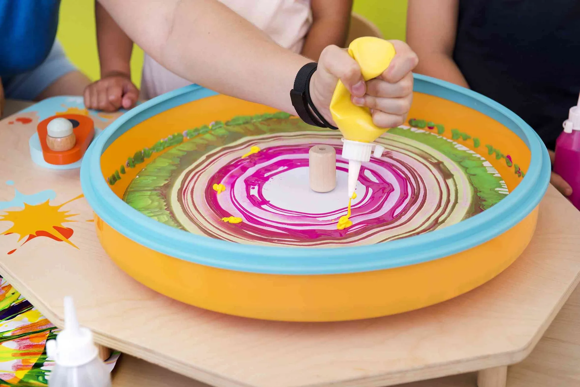 Mit der Farbenschleuder von Jubee gelingt es bereits Kindern im Kindergartenalter, kleine künstlerische Meisterwerke zu schaffen. Die Farbenschleuder besteht aus einer runden Plastikscheibe mit erhöhten Rändern, auf dem rundes Papier eingespannt wird. Diese Scheibe befindet sich auf einem kleinen Holzgestell mit einer Kurbel. Wird ein Pinsel mit Farbe aufs Papier gehalten und gleichzeitig gedreht, entstehen mühelose tolle Kreismuster auf dem Papier. Kinder können darüber hinaus kleine Kunstwerke schaffen, indem sie Farbpunkte oder -linien auf dem Papier platzieren und anschließend die Kurbel drehen; durch die Fliehkraft entstehen wunderschöne Muster.