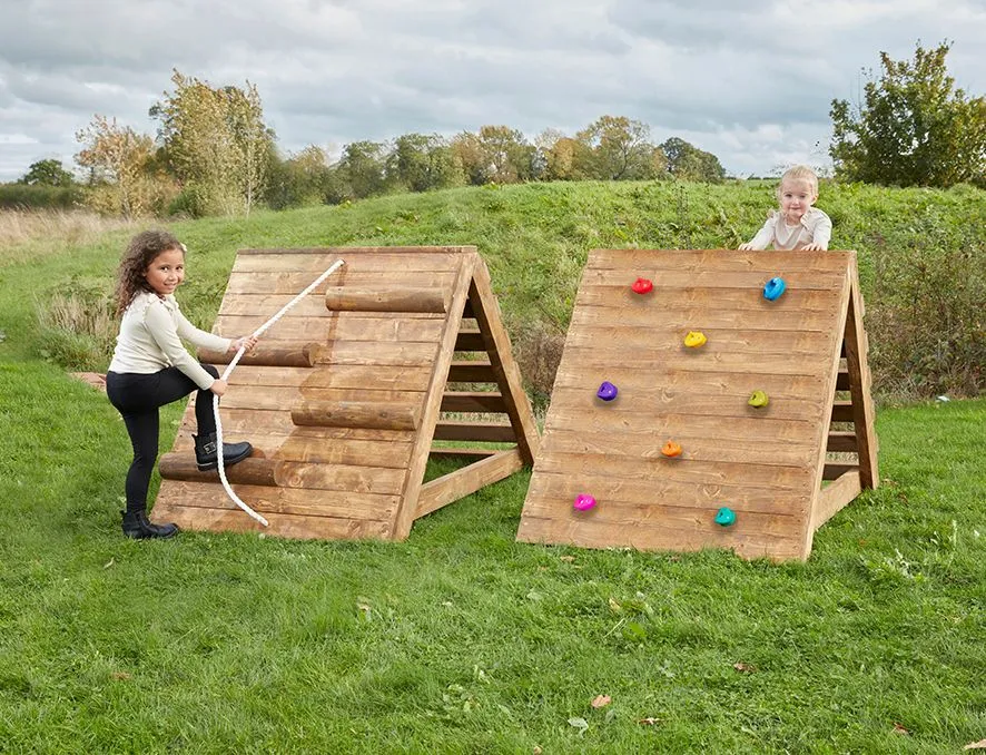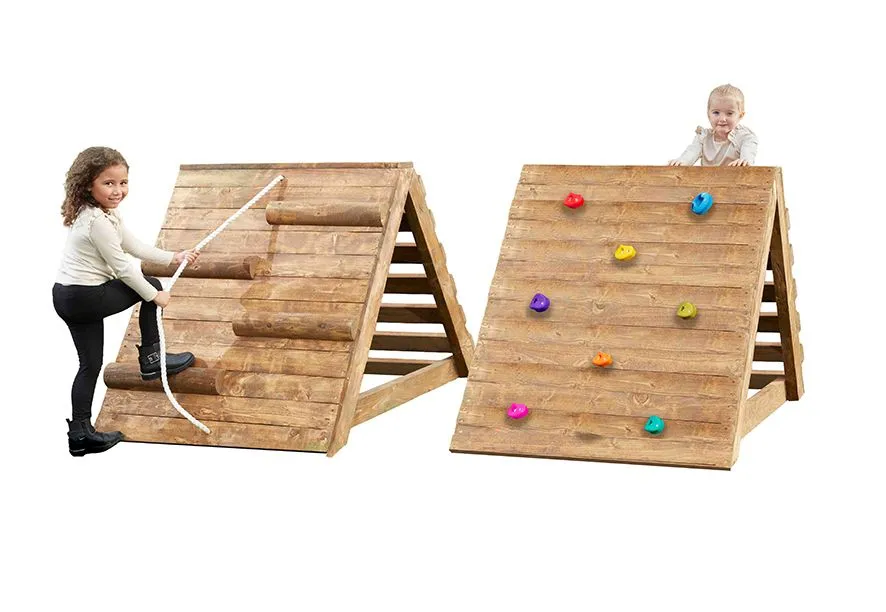Die unterschiedlichen Seiten des Klettergipfel regen zu vielfältigen Bewegungen an: Über die Klettersteine geht es Schritt für Schritt nach oben, während die Schräge mit Seil oder Holzstämmen zum Hochziehen, Rutschen oder kreativen Spielen einlädt. Kinder trainieren dabei Koordination, Kraft und Gleichgewichtssinn, ohne es als „Übung“ wahrzunehmen – sie erleben einfach nur Abenteuer auf ihrem Klettergipfel.