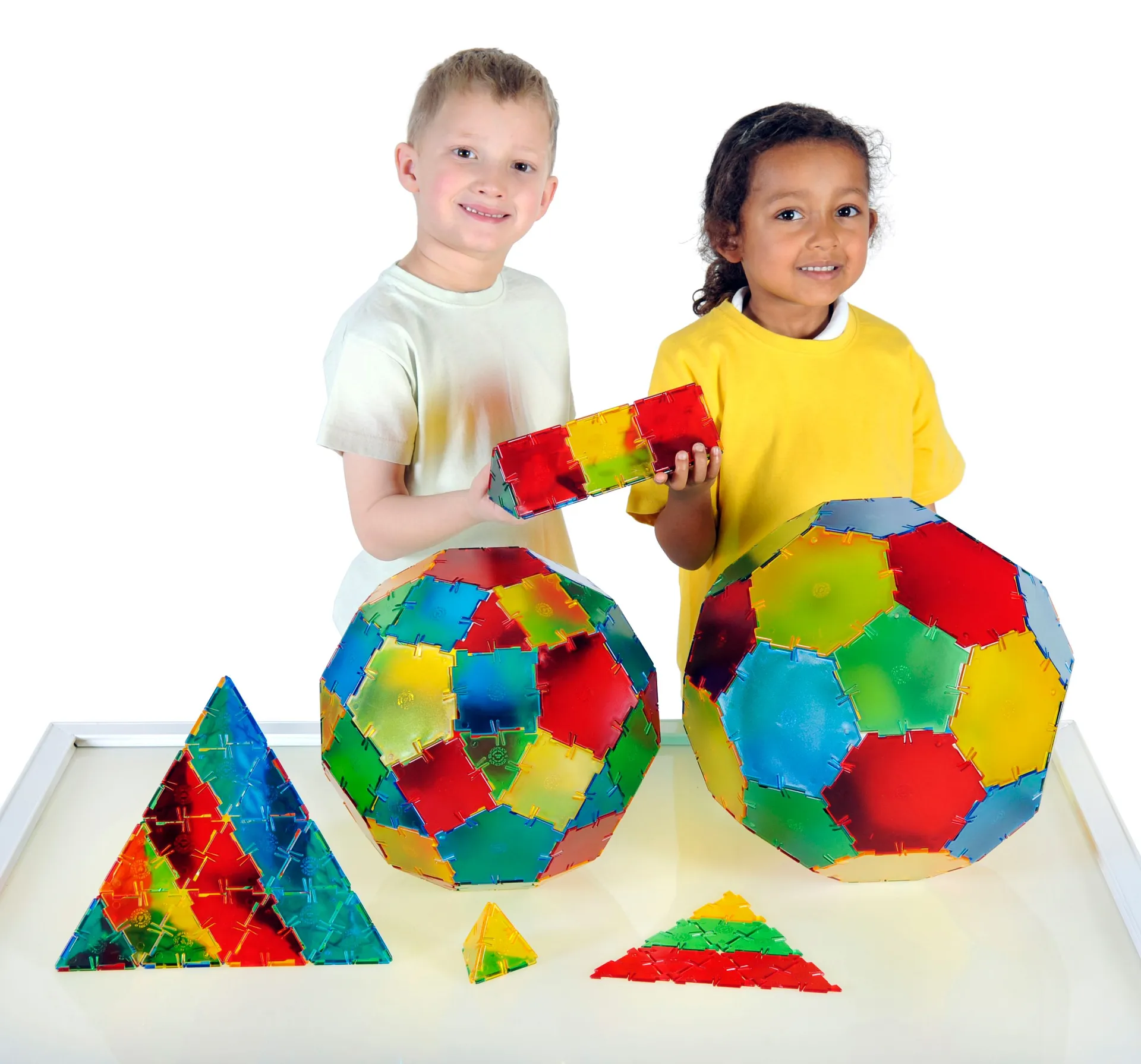 Das Geo-Bauset für Kinder besteht aus 184 bunt-leuchtenden Teilen: 20 Hexagone, 40 Quadrate, 24 Pentagone und 100 Dreiecke laden Kinder zum Bauen und Basteln ein. Der Kreativität sind fast keine Grenzen gesetzt!