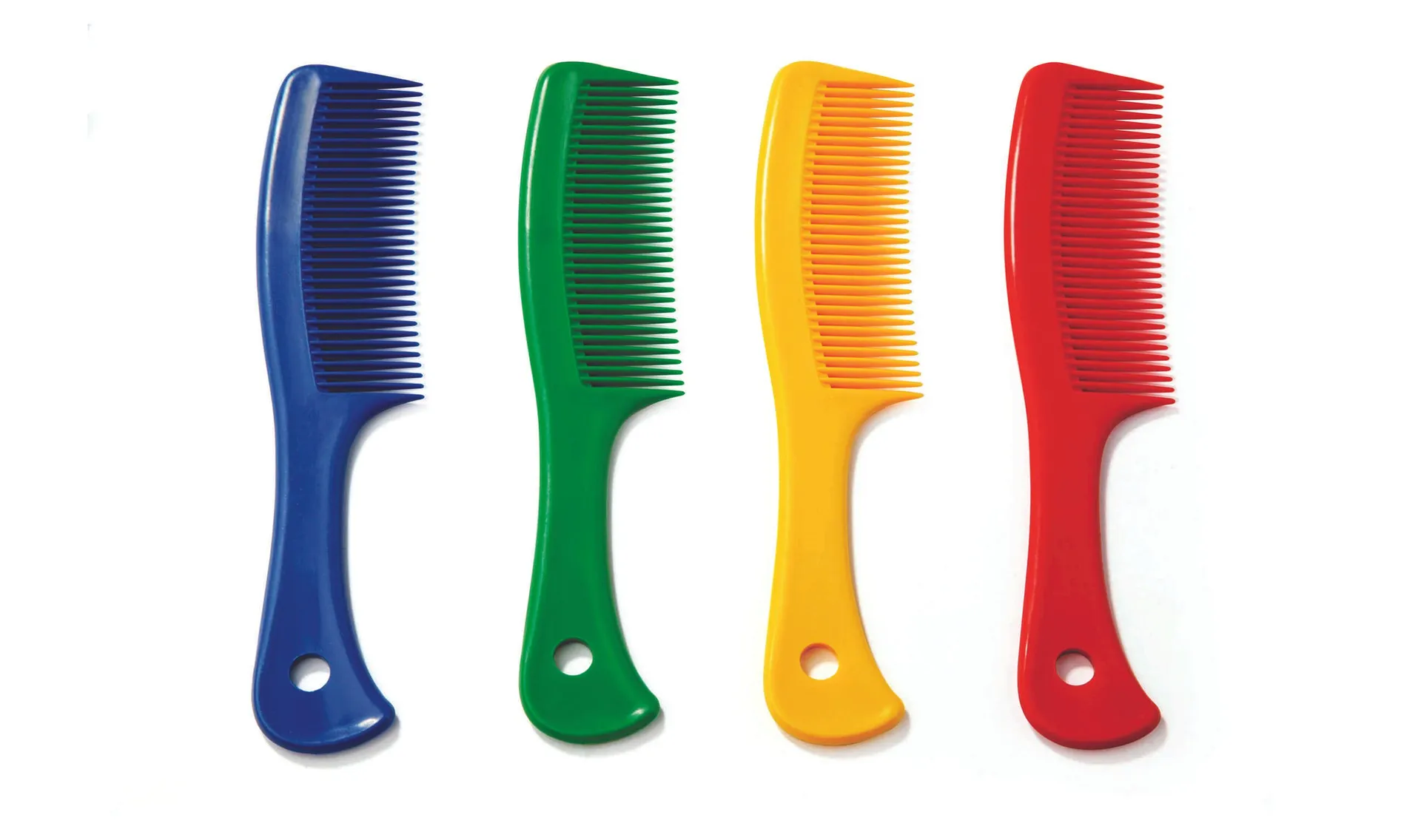 Der Griffkamm mit Loch ist in vier lebhaften Farben erhältlich – blau, grün, gelb und rot. Diese Farben sorgen nicht nur für gute Laune, sondern machen den Kamm auch leicht in der Handtasche oder im Badezimmer auffindbar.