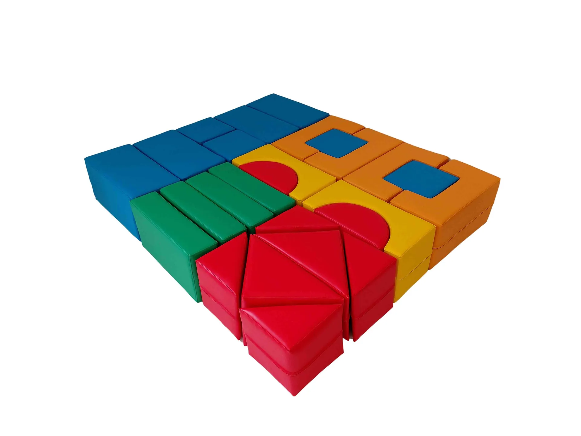 Das Set besteht aus 26 verschiedenen Elementen: 2 Dreiecke (30 x 30 x 60 cm), 4 Dreiecke (30 x 30 x 30 cm), 2 Brücken (30 x 30 x 60 cm), 2 Halbkreise (42 x 21 x 30 cm), 4 Zinnen (30 x 30 x 60 cm); 4 Riegel (15 x 30 x 60 cm), 4 Quader (30 x 30 x 60 cm), 4 Würfel (30 x 30 x 30 cm). Mit den vielfältigen Formen der Schaumstoffbausteine können Kinder immer wieder neue Welten erschaffen, die ihre Fähigkeiten und ihr Selbstbewusstsein stärken. Ein Muss für jeden Spielraum!