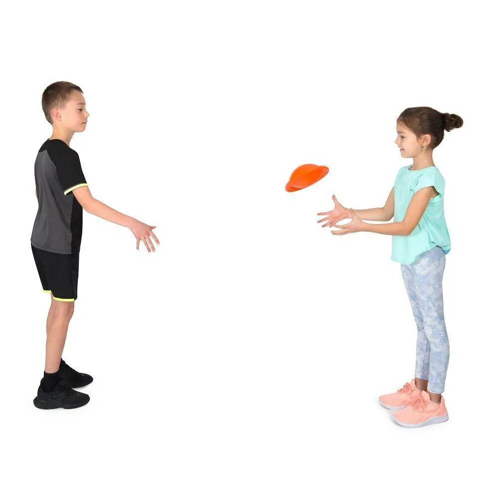 Die 6 bunten Spielbälle (in Blau, Gelb, Grün, Orange, Rot und Lila) hüpfen wie Bälle und fliegen wie Frisbees. So richtig Spaß macht das Werfen und Fangen in Zweier-Teams oder richtigen Mannschaften. Um beim Schießen immer präziser zu werden, bietet sich ein Handball- oder Hockey-Tor an. Ein Ball misst 20 cm im Durchmesser und wiegt 140 Gramm. Er ist aus PVC gefertigt und schwimmt. Neben Sporthalle, Park und Garten ist er somit auch im Wasser einsetzbar.