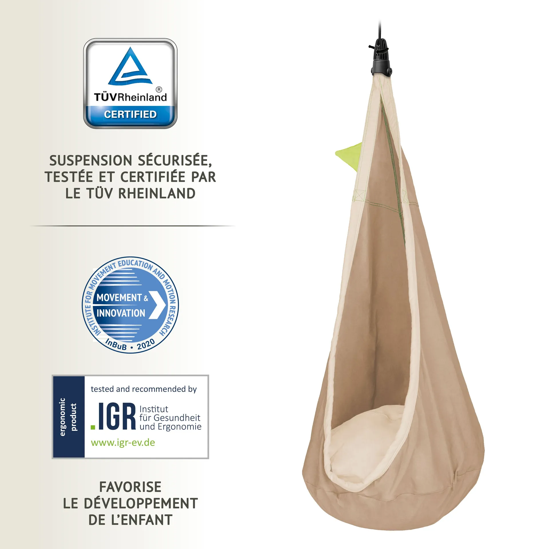Ein herausragendes Merkmal der La Siesta Hängehöhle ist der gepolsterte Rand, der nicht nur den Komfort erhöht, sondern auch Abnutzung vermindert. Dies verspricht Langlebigkeit, sodass Ihr Kind über viele Jahre Freude an seiner La Siesta Hängehöhle haben kann. Sicherheit steht bei dem Design im Vordergrund, weshalb der Sicherheitswirbel das Eindrehen der Hängehöhle verhindert. Dies trägt nicht nur zur Sicherheit bei, sondern schont auch das Material.