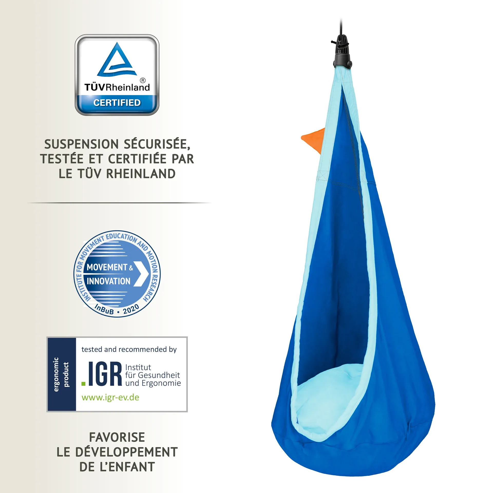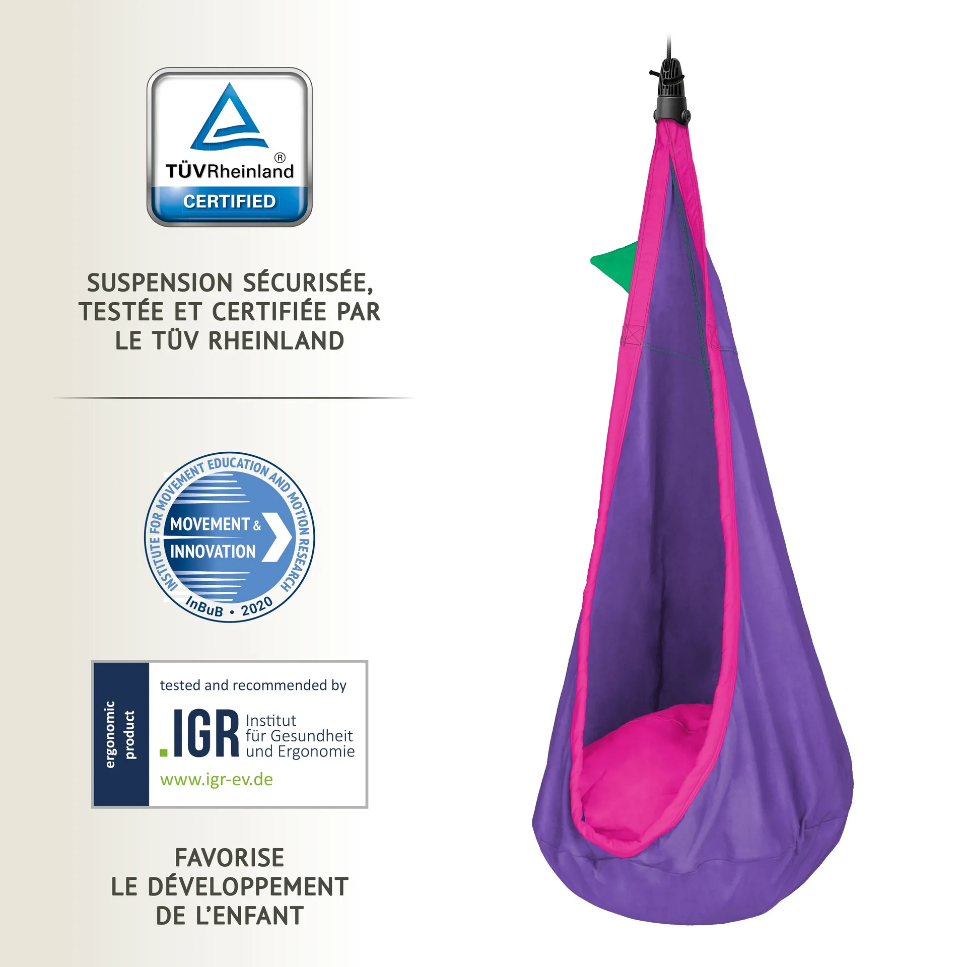 Ein herausragendes Merkmal der La Siesta Hängehöhle ist der gepolsterte Rand, der nicht nur den Komfort erhöht, sondern auch Abnutzung vermindert. Dies verspricht Langlebigkeit, sodass Ihr Kind über viele Jahre Freude an seiner La Siesta Hängehöhle haben kann. Sicherheit steht bei dem Design im Vordergrund, weshalb der Sicherheitswirbel das Eindrehen der Hängehöhle verhindert. Dies trägt nicht nur zur Sicherheit bei, sondern schont auch das Material.