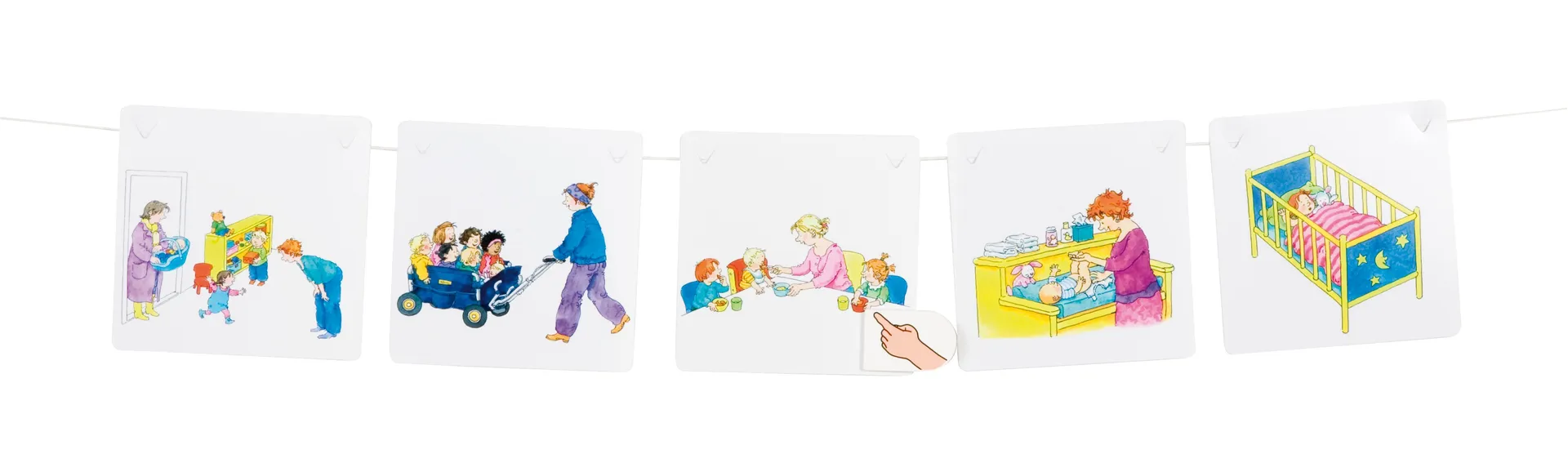 Mit den 22 farbenfroh bedruckten Plastikkarten und den zwei zusätzlichen Blankokarten können individuelle Tagesabläufe gestaltet werden. Binden Sie die Karten einfach an die mitgelieferte fünf Meter lange Nylon-Schnur und verwenden Sie den handförmigen Zeiger, um klar auf die aktuell stattfindenden Aktivitäten hinzuweisen.