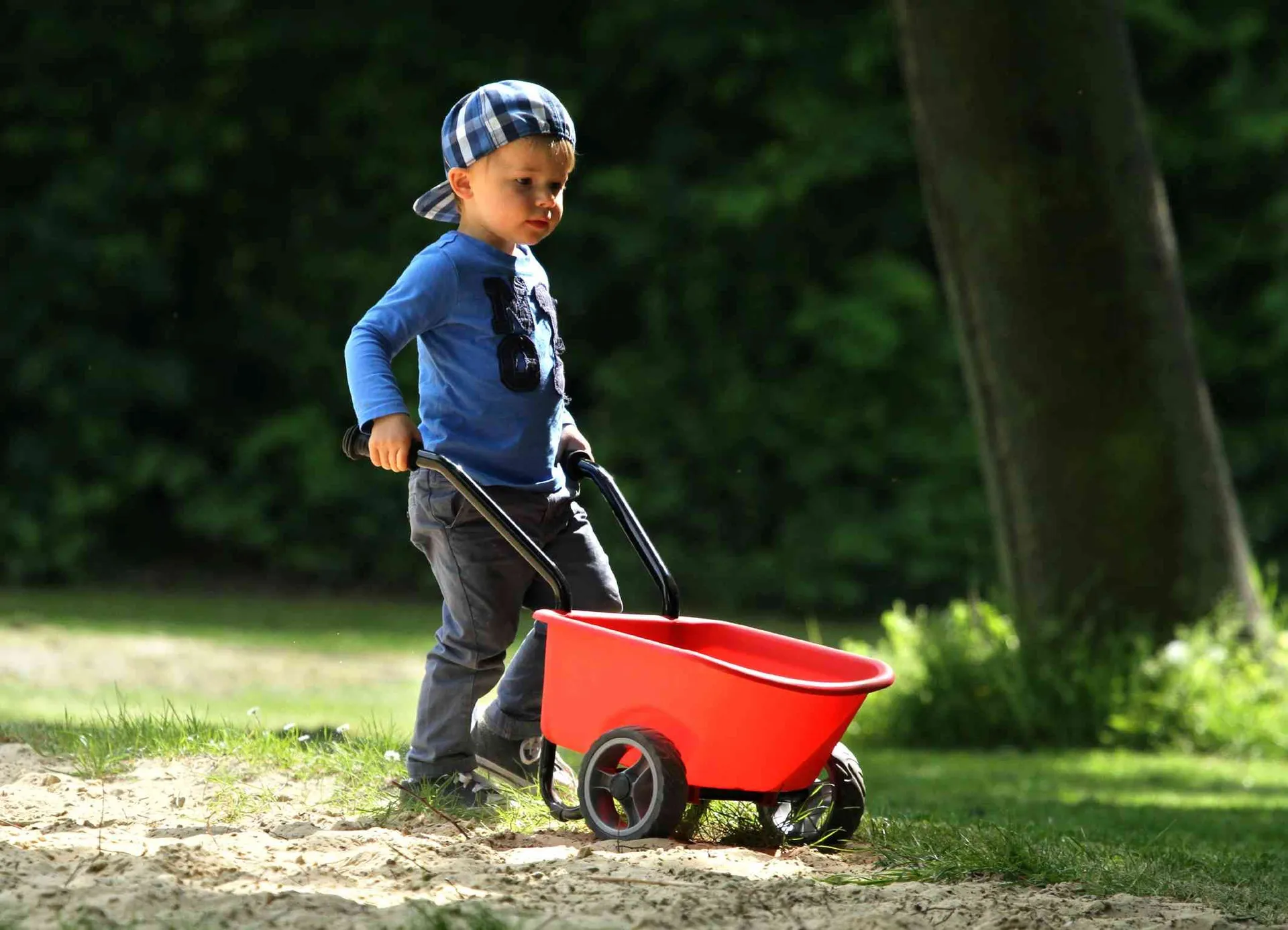 Der Transport von Gegenständen mit der Kinderschubkarre fördert die Entwicklung der Grobmotorik und trainiert ganz nebenbei den Gleichgewichtssinn.