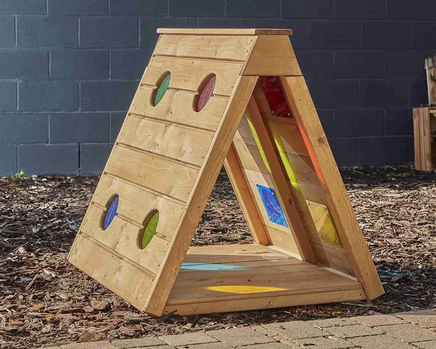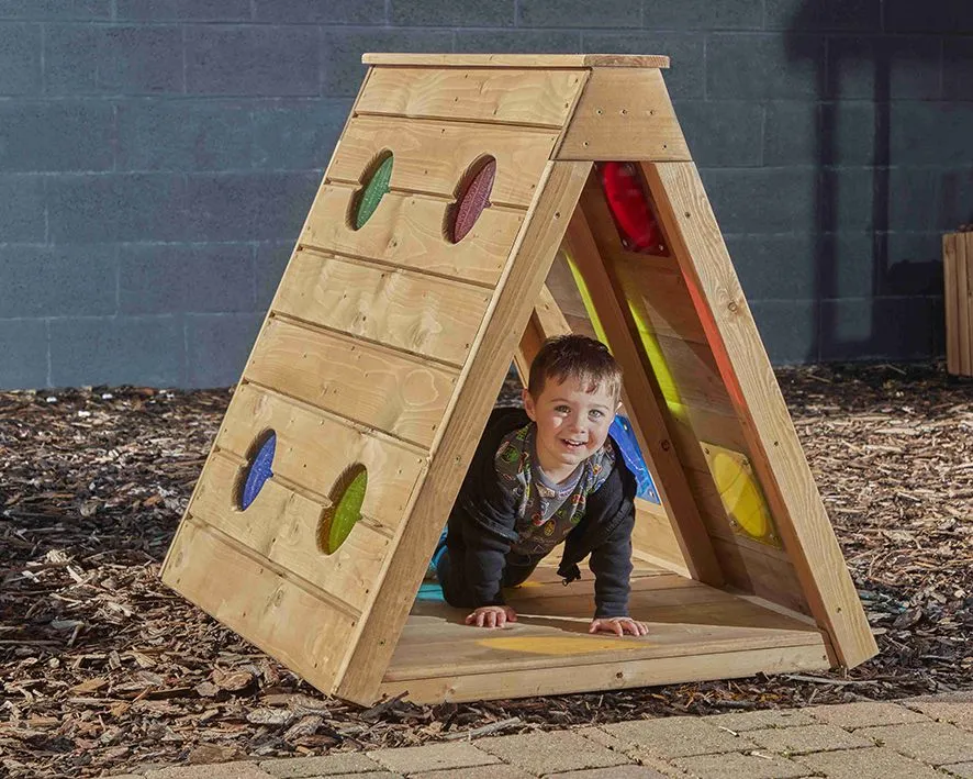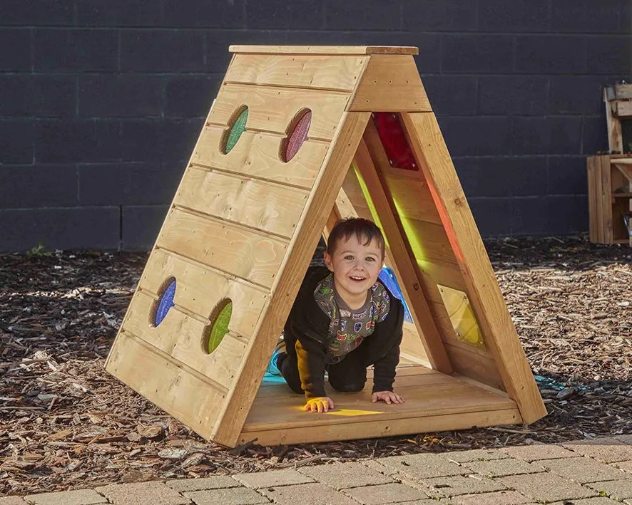 Besonders spannend sind die integrierten bunten Farbfenster. Sie tauchen das Innere vom Krabbelhaus für Kinder in farbiges Licht, regen die visuelle Wahrnehmung an und fördern die Neugier. Kinder können hindurchschauen, mit Licht und Schatten experimentieren und ihre Umgebung auf spielerische Weise neu entdecken. So kombiniert das Spielgerät motorische Förderung mit kreativen Sinneserfahrungen.