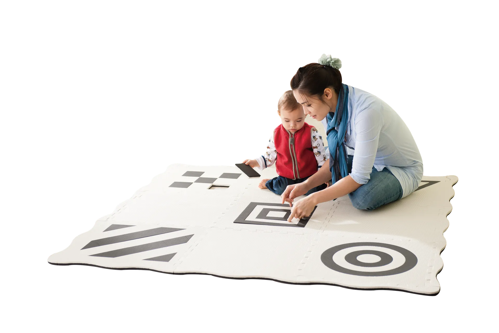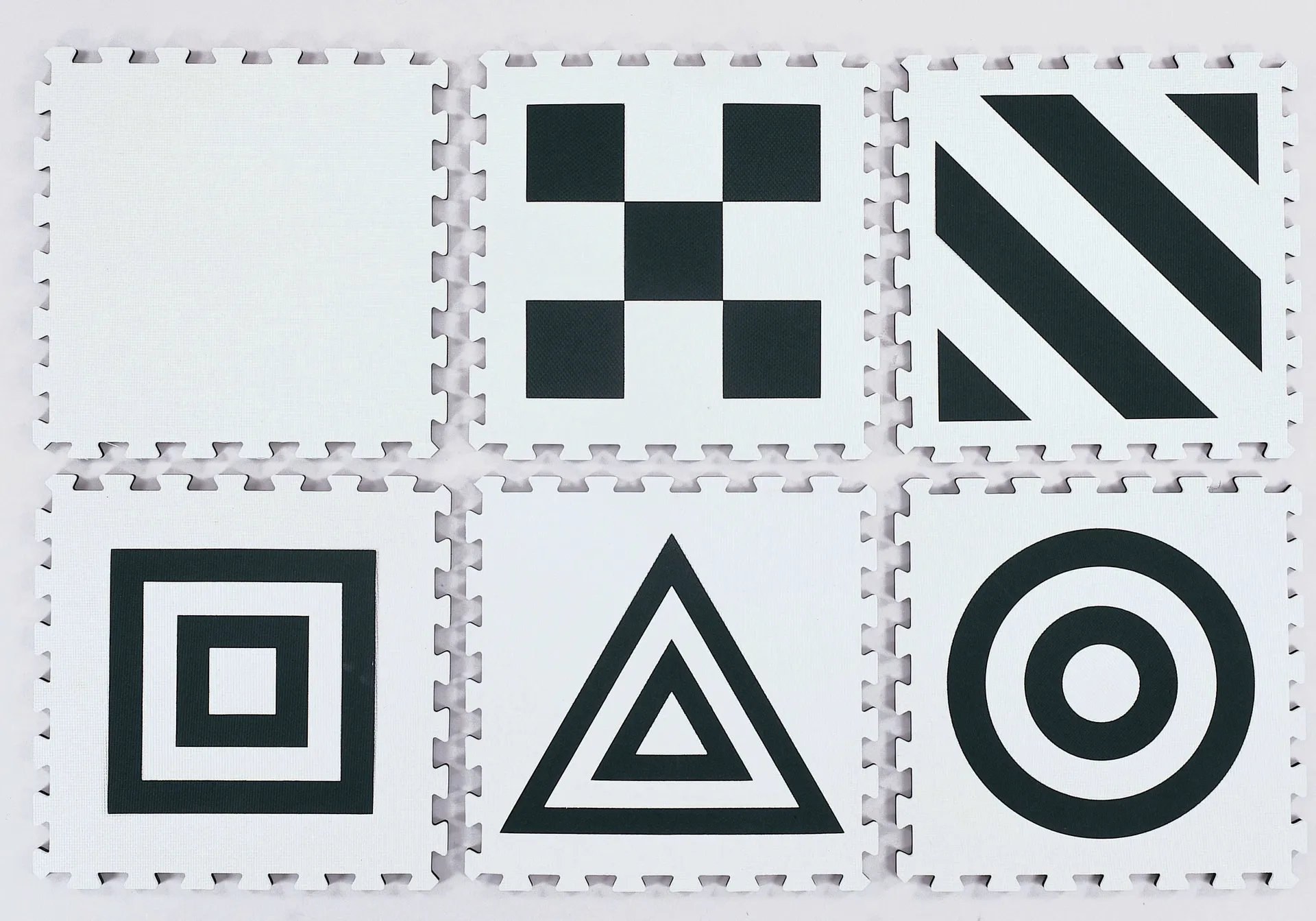 Die großen Puzzle-Scheiben lassen sich schon von kleineren Kindern gut aneinandersetzen. Sie sind großzügig gezahnt und passen in unterschiedlichen Varianten zusammen. Wer keine Lust auf eine plane Verlegung hat, setzt sie dreidimensional zu einem Würfel zusammen oder kann Häuser und andere kreative Objekte erstellen. Vor allem besticht dieses Legespiel in Schwarz-Weiß durch die ausgestanzten geometrischen Formen, die sich herausnehmen und extra bespielen lassen.