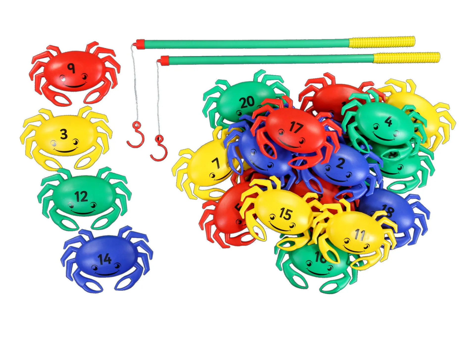 Die freundlich schauenden Krebse aus buntem Kunststoff sind von 1 bis 20 nummeriert und verbessern so das Zahlenverständnis der Kinder. Die Verbindung der Zahlen mit den vier unterschiedlichen Farben, Rot, Gelb, Grün und Blau, fördert das Denkvermögen, da sich Farb-Zahlen-Kombinationen leichter merken lassen. Die Krebse sind 23 cm breit und haben ausreichend große Löcher in ihren Krebsscheren, so dass auch Kinder ab 3 Jahren sie mit den 72 cm langen Angelruten einfangen können.