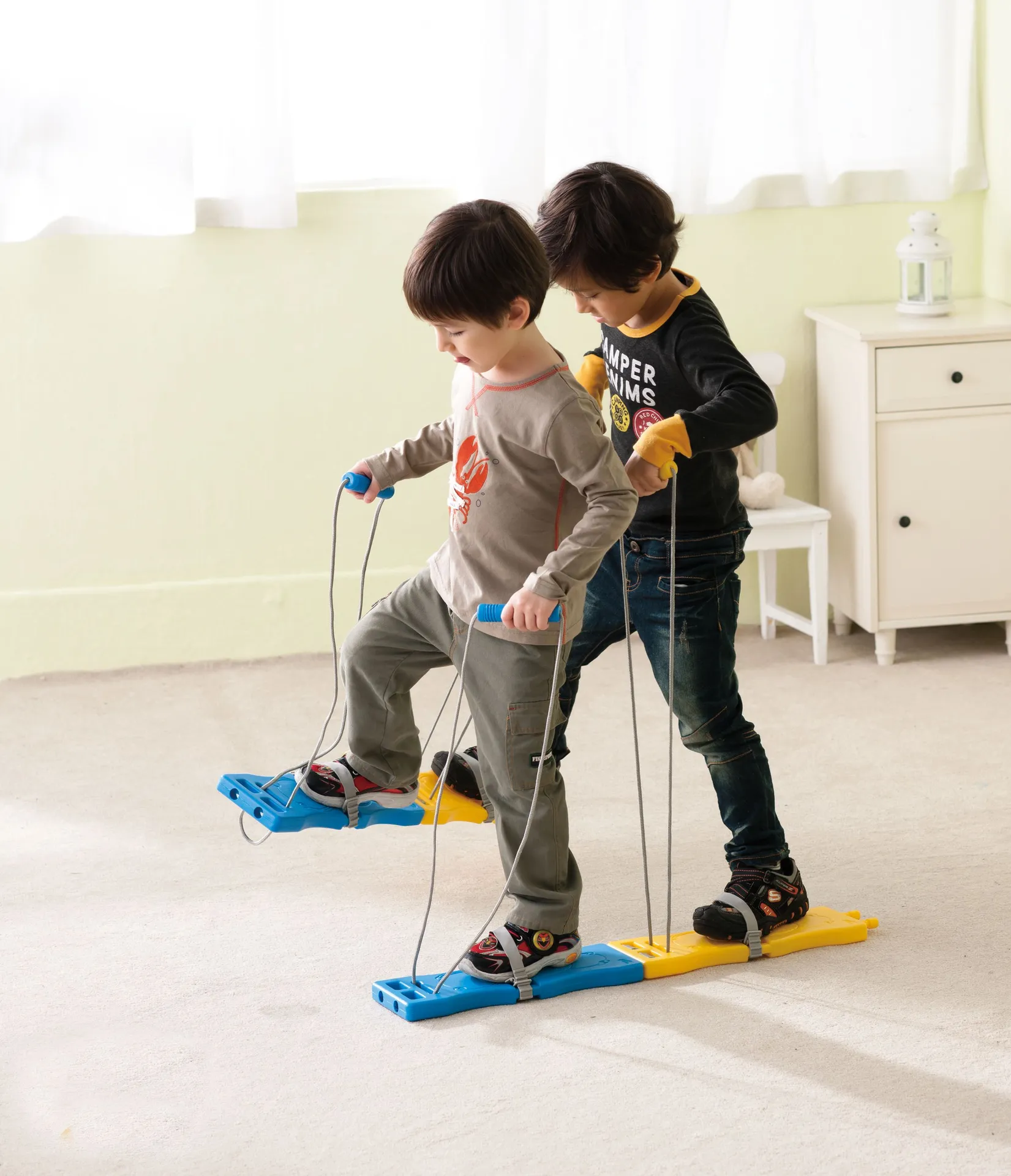 Um die Teamarbeit zu stärken, sind die Laufbretter farblich gekennzeichnet. So erkennt jedes Kind sofort, wie viele Personen am Spiel teilnehmen können. Die insgesamt zwei Paare können beliebig erweitert werden, sodass lange Schlangen für viele Kinder entstehen. Aber auch zu zweit können Kinder ab drei Jahren an ihren Bewegungsabläufen arbeiten. Mithilfe einer kleinen Sicherung lassen sich die einzelnen Fußbretter fest miteinander verbinden und lösen sich beim Laufen nicht voneinander.
