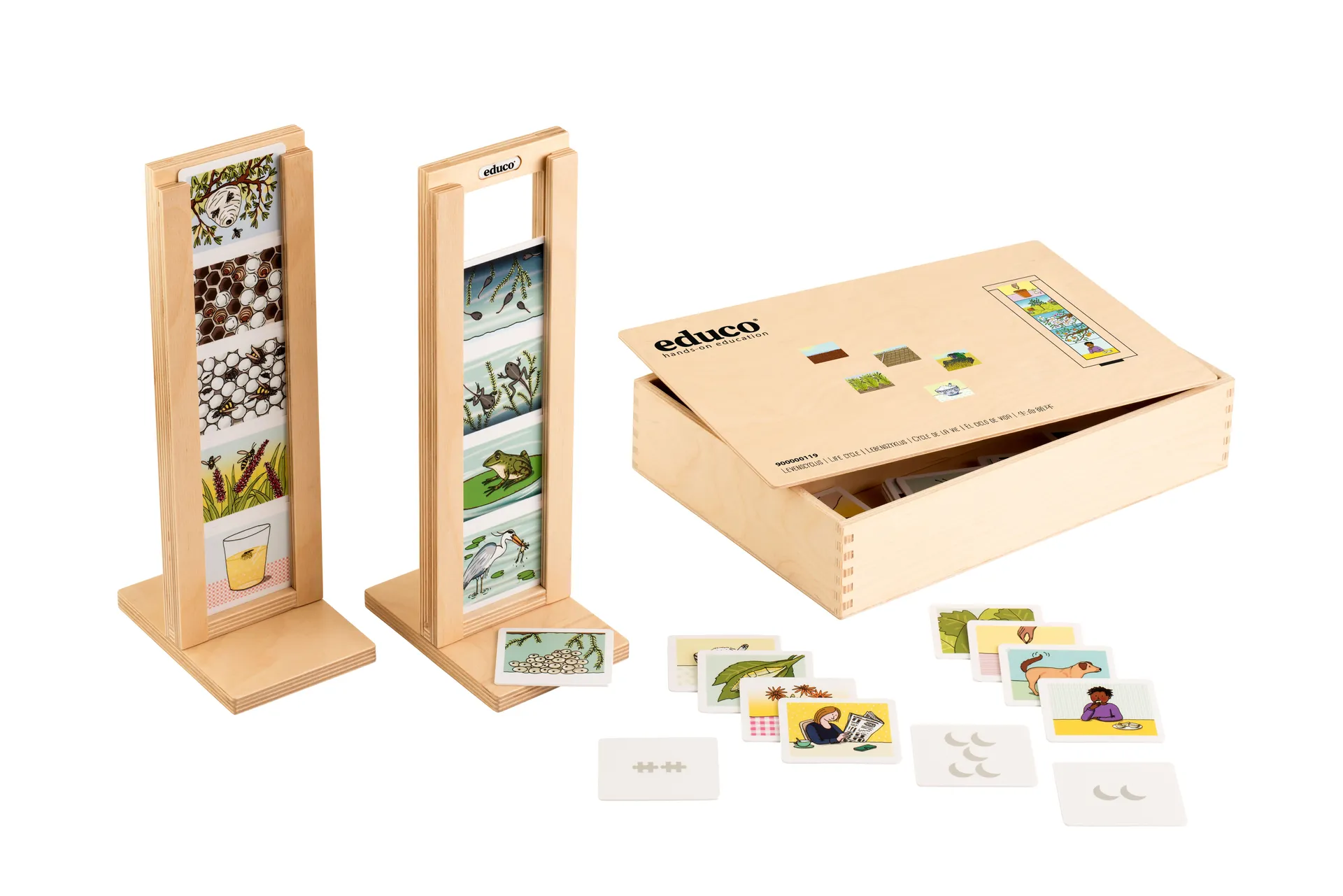 Das Lebenszyklus-Set von Educo bietet eine umfassende Darstellung der Lebenszyklen verschiedener Lebewesen und Pflanzen. Es umfasst alle Phasen des Lebens, einschließlich des Todes. Die Selbstkontrollfunktion ermöglicht es, diesen Schritt bei Bedarf auszulassen, was zu Gesprächen über Tod und die damit verbundenen Emotionen führen kann.
