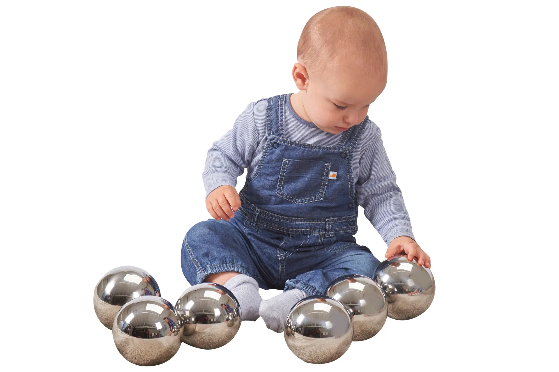 Mit diesen Kugeln aus spiegelndem Stahl können Sie die Kinder auf mehrere Arten fördern. Einerseits können sie ihre Umgebung als kullerndes Spiegelbild entdecken. Die sechs gleich großen Spielkugeln mit 97, 215, 218, 220, 225 und 306 Gramm können die Kinder im Gewicht direkt miteinander vergleichen. Darüber hinaus unterscheiden sich alle Spielkugeln im Klang. Beim Spielen entdecken die Kinder nicht nur die einzigartige Akustik jeder Kugel, sondern trainieren ebenso Hör- und Sehvermögen sowie die Hand-Augen-Koordination und Feinmotorik.