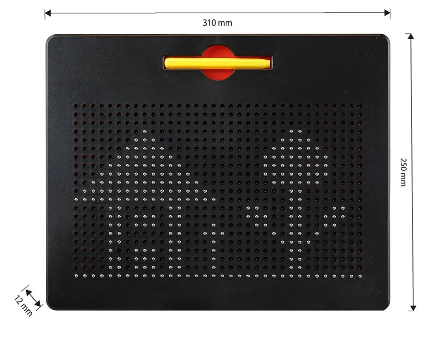 Die Oberfläche der Magnetischen Zeichentafel besteht aus einem feinmaschigen Gitter, unter dem sich die magnetischen Kügelchen befinden. Wenn der Stift über die Tafel gezogen wird, heben sich die weißen Kügelchen und bilden nach und nach ein Bild. Dies bietet eine tolle Möglichkeit, ohne Kleckern oder Kritzeln kreative Werke zu schaffen. Deshalb eignet sich die Magnetische Zeichentafel besonders gut für unterwegs, bei langen Autofahrten oder in Wartezimmern. Langeweile hat hier keine Chance!