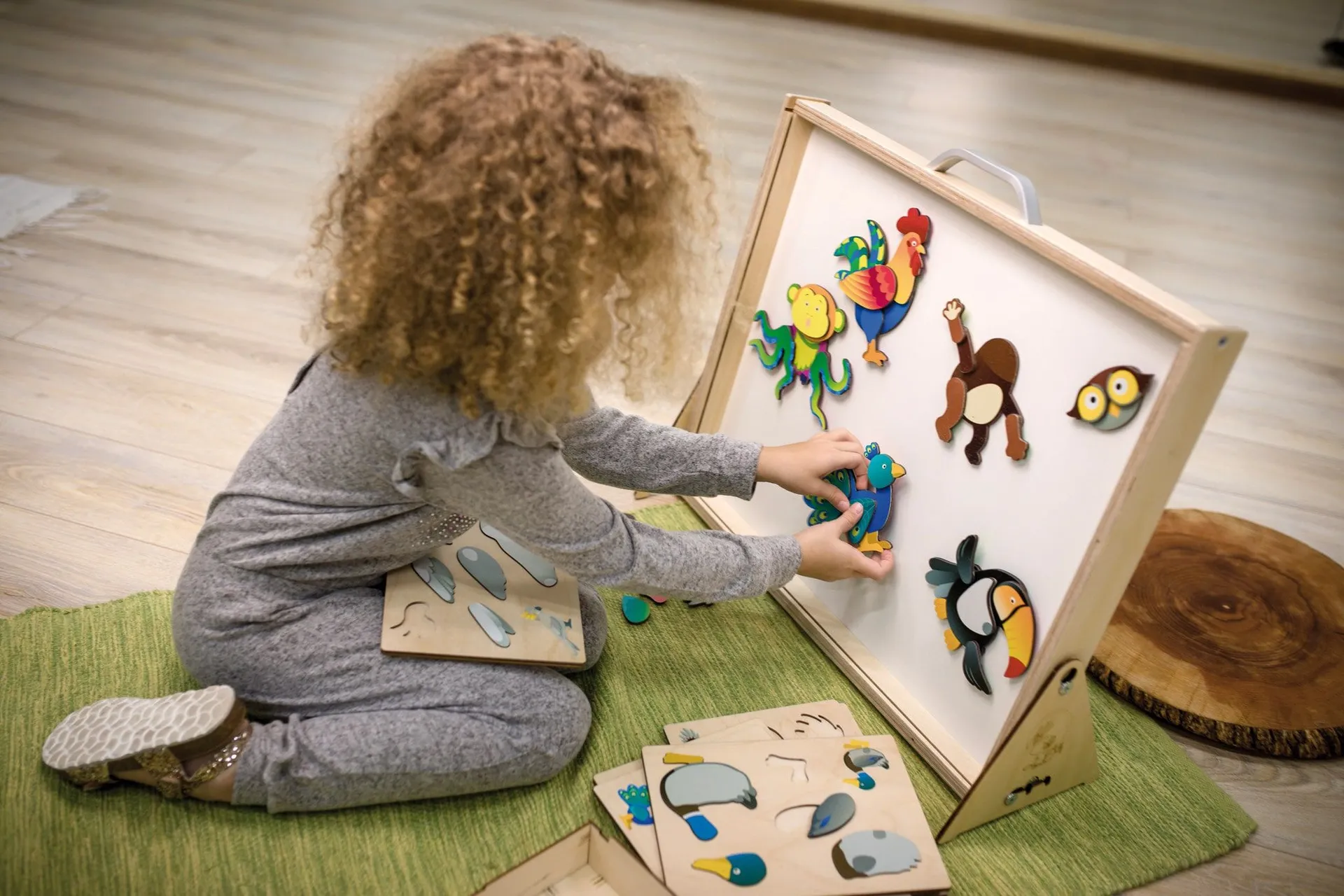 Bei diesem Magnetpuzzle ist auch die eigene Vorstellung gefragt. Als kleine Hilfe, wie das Tier später aussehen soll, gibt es auf jedem zugehörigen Tableau jeweils eine Abbildung von Hahn, Ente, Strauß, Tukan, Eule und Kakadu. Jetzt müssen die Teile nur noch magnetisch aneinander geheftet werden. Dabei fällt den Kindern auf: Die Einzelteile können auf magische Weise aneinander "geklebt" werden.