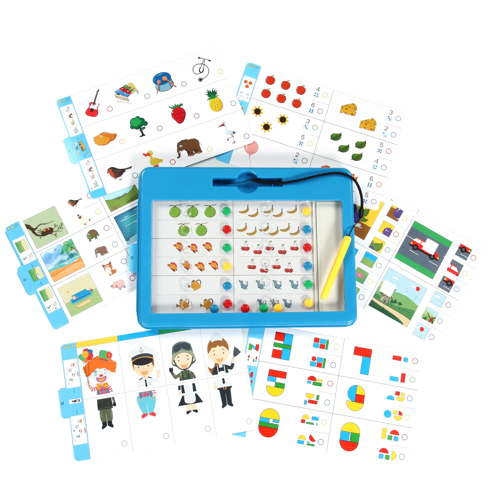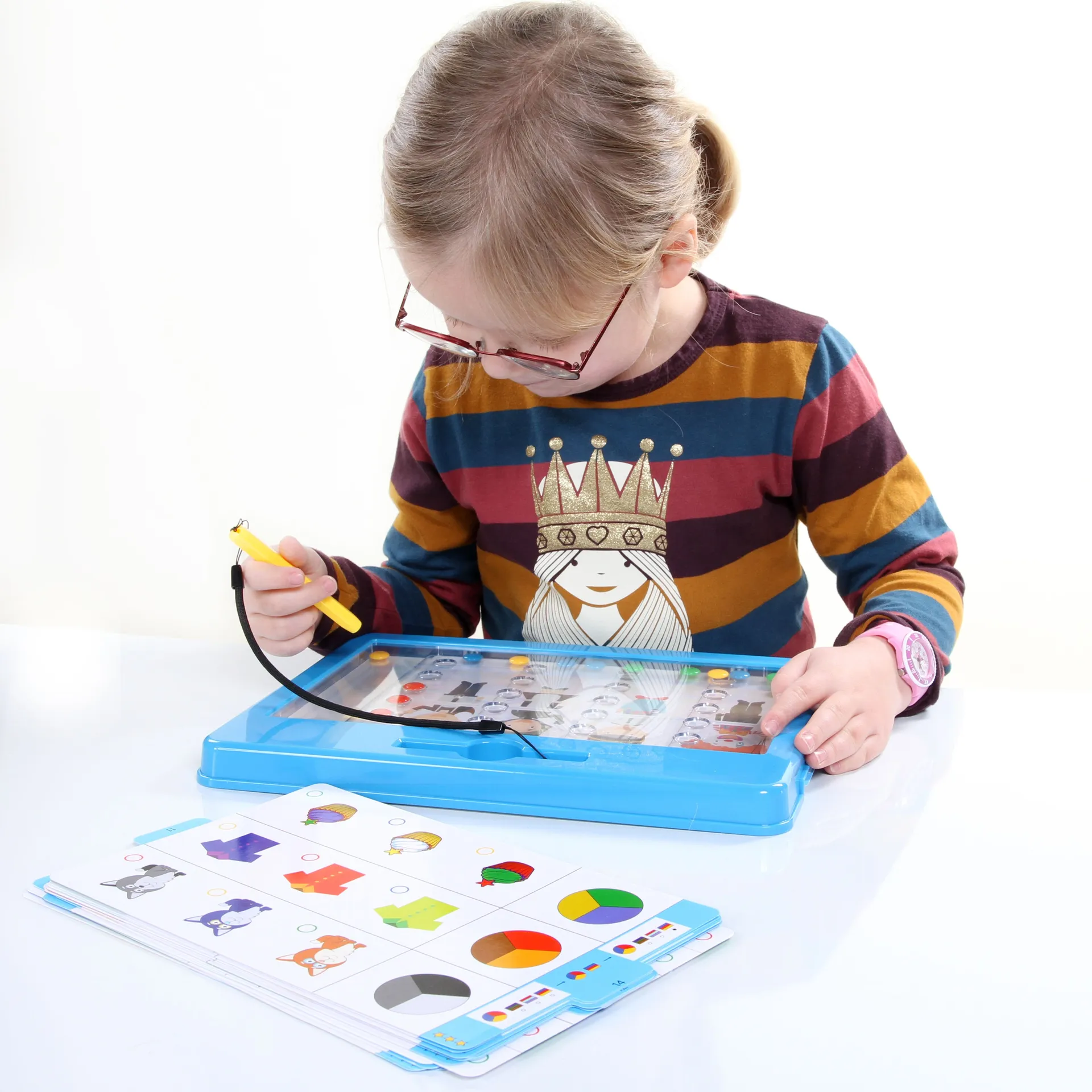 Das Kombinationsspiel ist magnetisch und besteht aus Kunststoff. Das macht es robust und langlebig. In den blauen Rahmen mit zugehörigem Magnetstift können die im Lieferumfang enthaltenen Aufgabenkarten kinderleicht eingeschoben werden. Insgesamt enthält das Spiel acht Aufgabenkarten aus den Bereichen Farben und Formen sowie Wörter und Logik. Die austauschbaren Karten bieten Eltern, Lehrern und Erziehern viele Möglichkeiten für pädagogisch wertvolles Spielen.