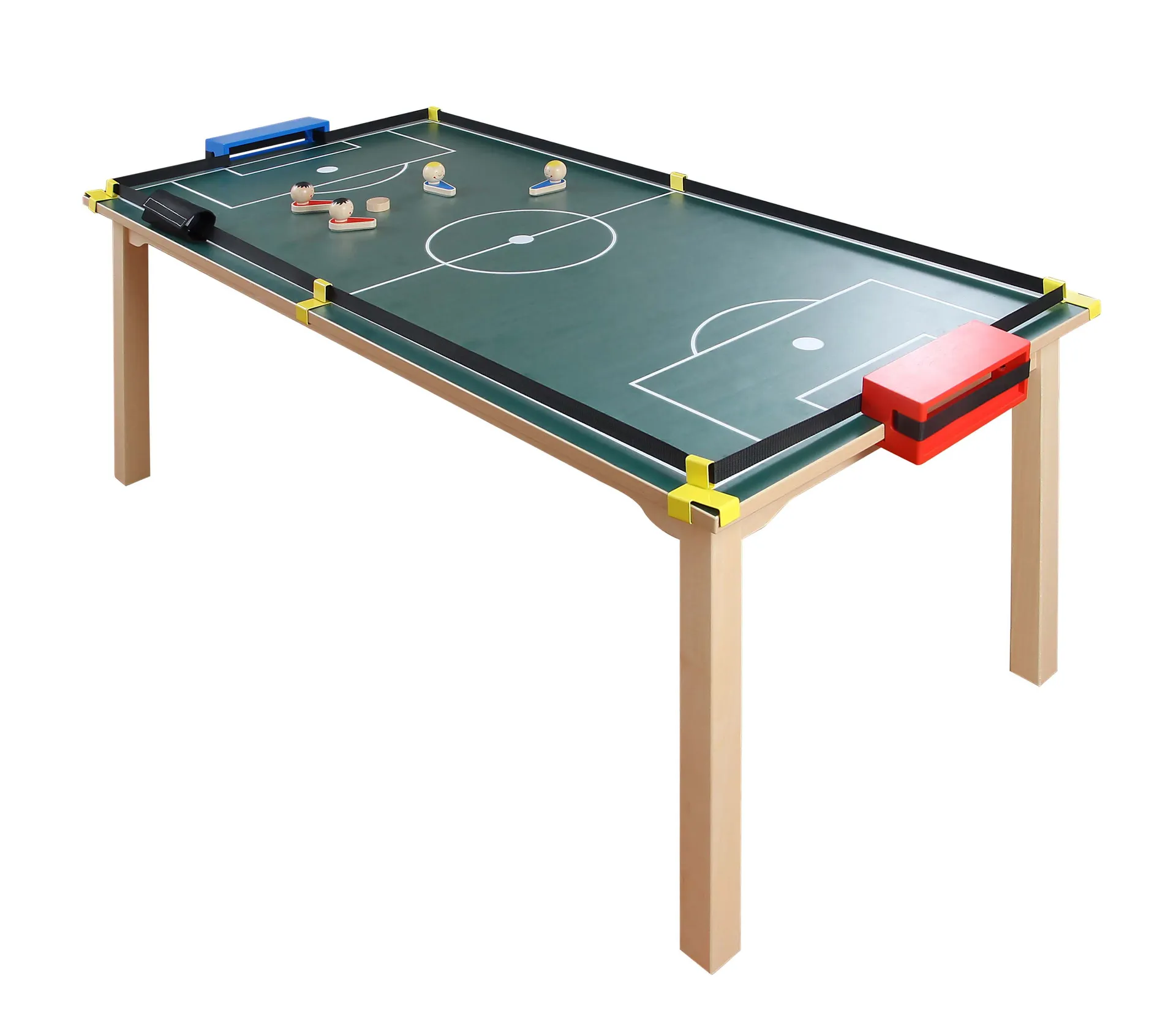 Im Kindergarten kann der mobil einsetzbare Kicker mühelos in verschiedenen Gruppenräumen eingesetzt werden. Auch die Verwendung im Freien ist kein Problem. Der Kicker wird aus Holz und Kunststoff gefertigt und sollte daher stets wettergeschützt aufbewahrt werden. Das abwechslungsreiche Tischfußballspiel eignet sich für Kinder ab drei Jahren, macht aber auch Erwachsenen großen Spaß. Tischfußball fördert die Hand-Augen-Koordination, das Reaktionsvermögen und vieles mehr.