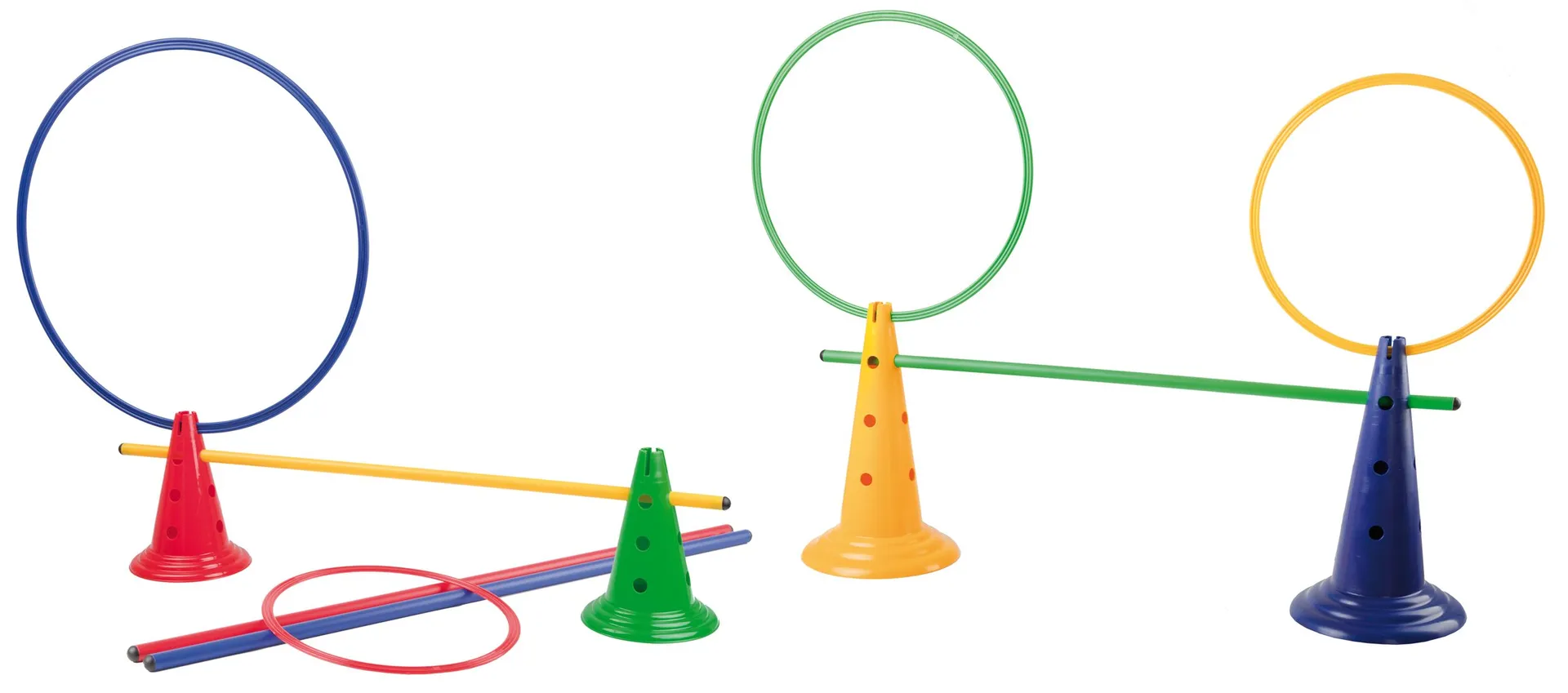 Das farbige Mobility-Action-Set besteht aus zwei Funktionskegeln mit einer Höhe von 30 cm. Zudem umfasst das Set zwei 50 cm große Kegel und vier 120 cm lange Rundstäbe. Für besonders viel Spielspaß sorgen die Flachreifen in verschiedenen Größen mit einem Durchmesser von 40, 50, 60 oder 70 cm. Gefahrloses und einfaches Anbringen der Bauteile: Die Funktionskegel verfügen an der Spitze über Schlitze. Dort lassen sich die Flachreifen kinderleicht und sicher einsetzen. Die Fixierung der Rundstäbe erfolgt an den Kegeln.