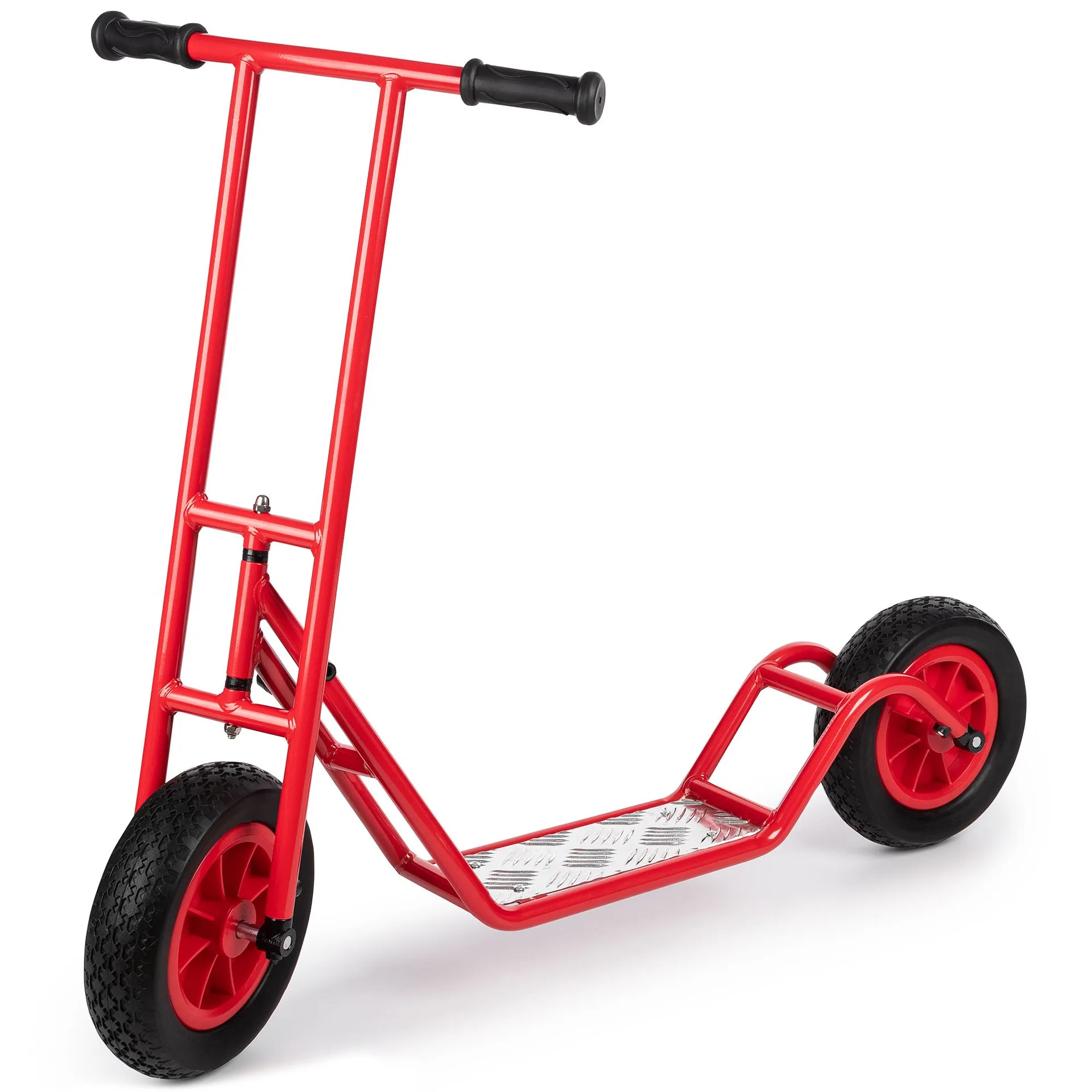 Mit seinen breiten Reifen und der großen Trittfläche bietet das knallrote Gefährt sicheres Fahrvergnügen. Der fest installierte Lenker misst 86 Zentimeter Höhe. Das Fahrzeug eignet sich damit für Kinder ab rund 6 Jahren. Damit geht es auf rasanter Fahrt und trotzdem rundum sicher in die Kita oder die Grundschule, und auch beim kleinen Fahrradausflug mit der Familie kann der Roller in puncto Geschwindigkeit nach etwas Übung locker mithalten. Für den spaßigen Fuhrpark in der Schulbetreuung oder im Hort bieten sich die robusten Kinderroller ebenfalls gut an.