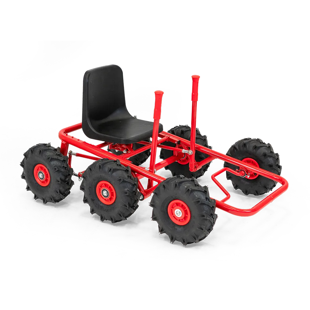 6-rädriger Gokart mit drei Achsen und Traktorreifen. Er verfügt über eine Hinterradlenkung für zusätzliche Manövrierfähigkeit und wird über zwei Lenkstangen gelenkt. Der Antrieb erfolgt durch Ihre Körperkraft über die Pedalstange an der Vorderachse. Mit dem ergonomischen Kunststoffsitz sitzt der Nachwuchsreiter immer sicher und stabil.