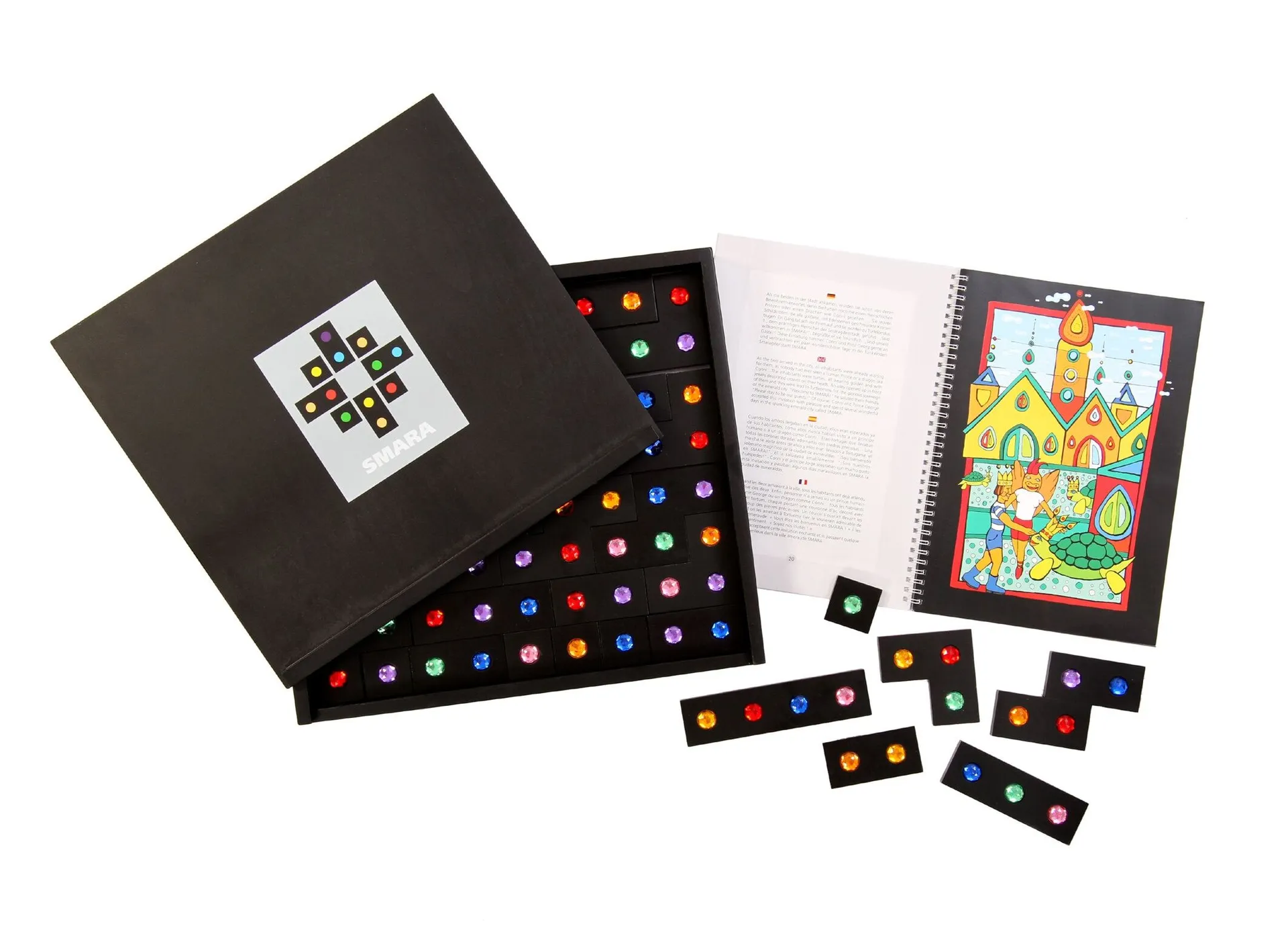 Smara ist ein hochwertiges Lernspielzeug, das aus Holz und funkelnden Acryl-Steinchen besteht. Es ist ideal für Kleinkinder im Kindergarten, ältere Schul- und Hortkinder sowie für die ganze Familie. Die Holzsteine, verziert mit Acryl-Edelsteinen in den sieben Farben des Regenbogens, eröffnen eine Vielzahl an Spielmöglichkeiten für ein bis fünf Spieler. Die insgesamt sechs verschiedenen Formen der Spielsteine, wie Winkel und Rechtecke, bieten abwechslungsreiche Herausforderungen.
