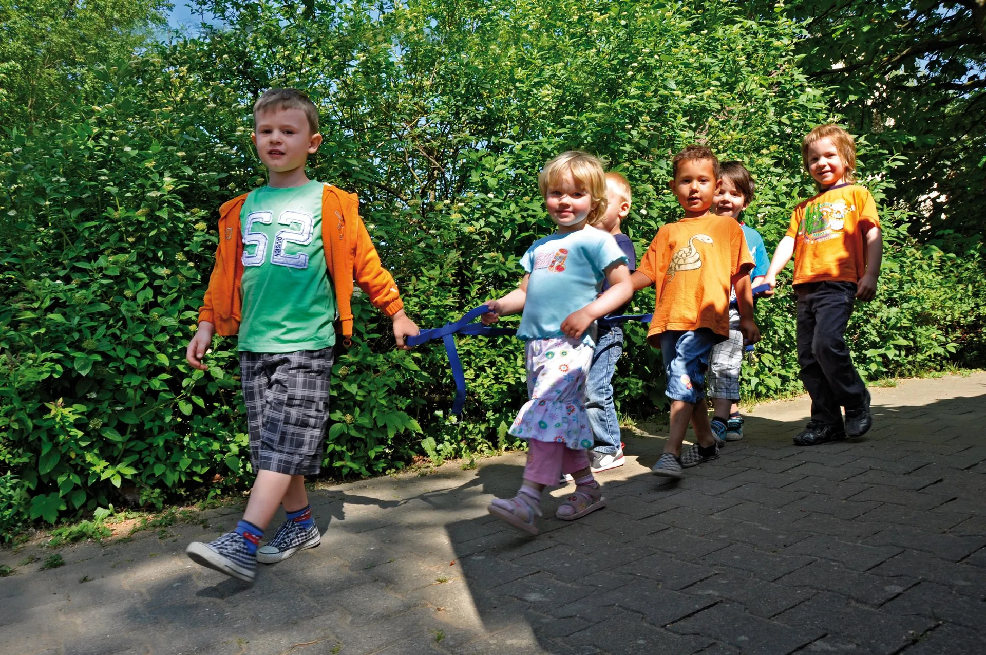 Haben Sie schon mal mit einer kleinen Rasselbande einen Spaziergang gemacht? Wenn mehrere über drei Jahre alte Kinder in Bewegung sind, ist Vorsicht geboten. Mit einer Sicherheitsleine, die hier vorgestellt wird, funktioniert das recht gut.