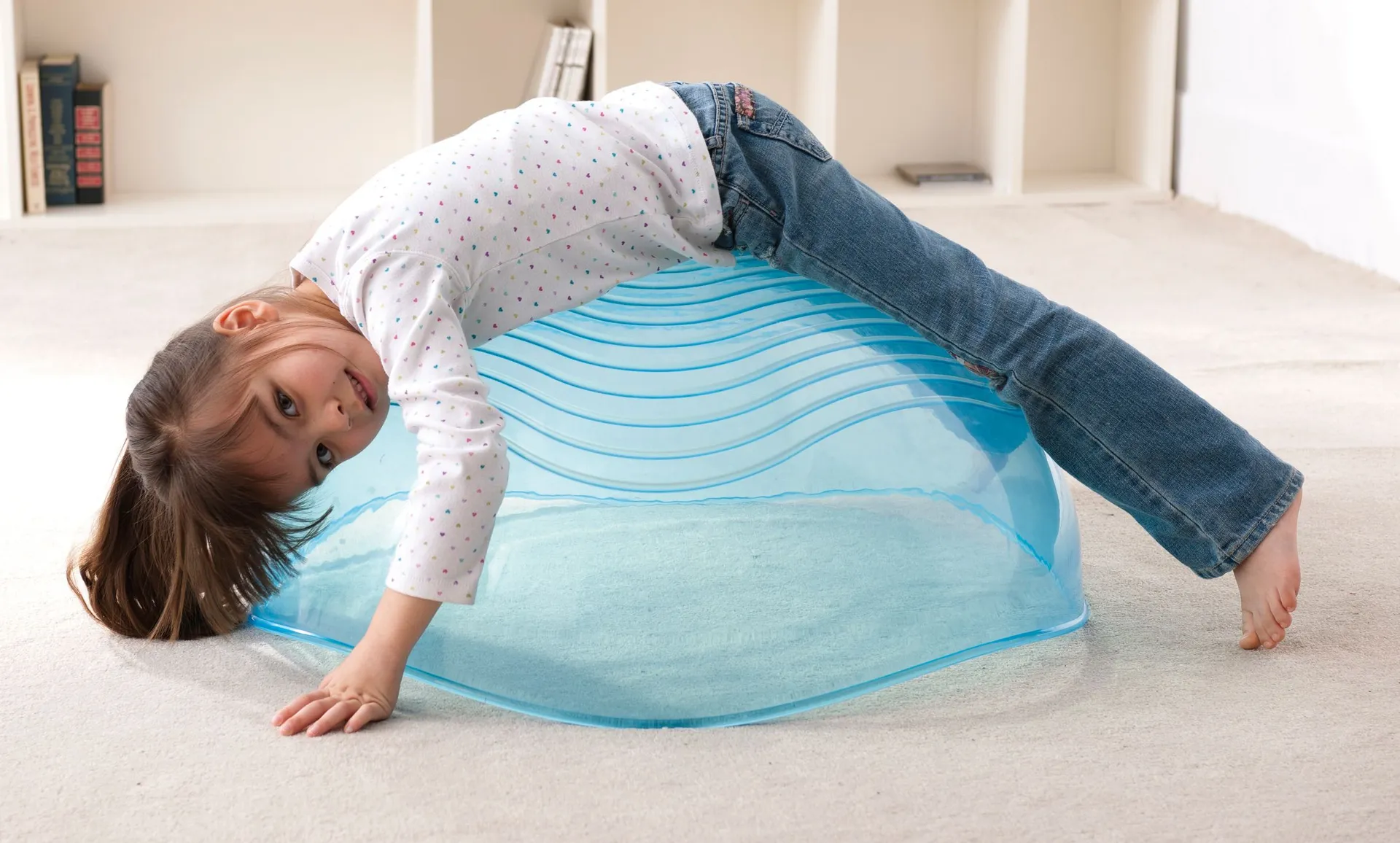 Die transparente Weplay Spielkugel lässt sich beim Drinsitzen, Drunterkriechen oder Drauflegen von kleinen Abenteurern verformen und springt anschließend wieder in den Ausgangszustand. Sicherheit bieten innen geriffelte Linien als Rutschhemmer und eine wellenartige Kante. Nach dem Austoben können Spielsachen gleich in der Kugel abgelegt werden.