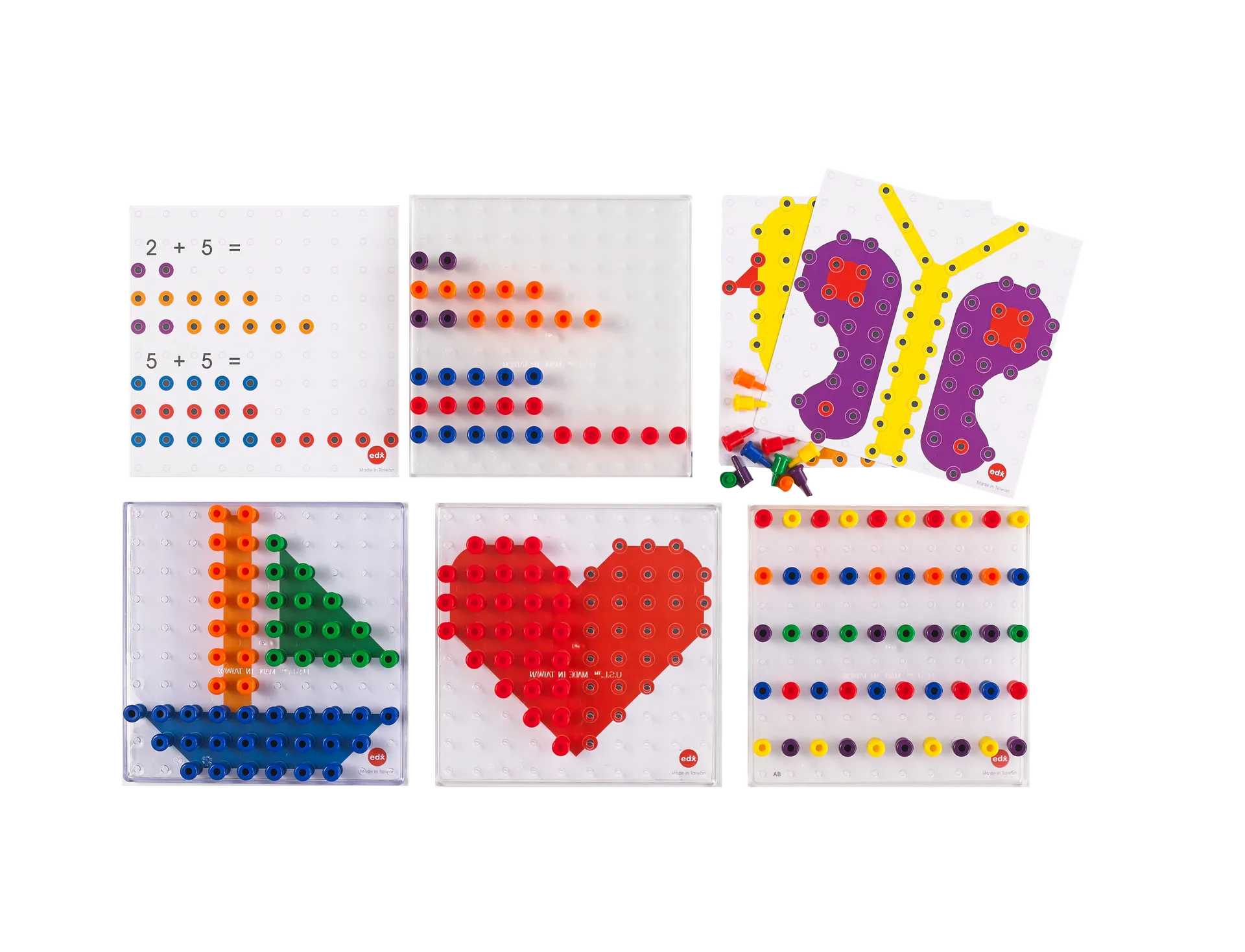 600 Stifte, 4 durchsichtige Stecktafeln und 15 Activity Karten