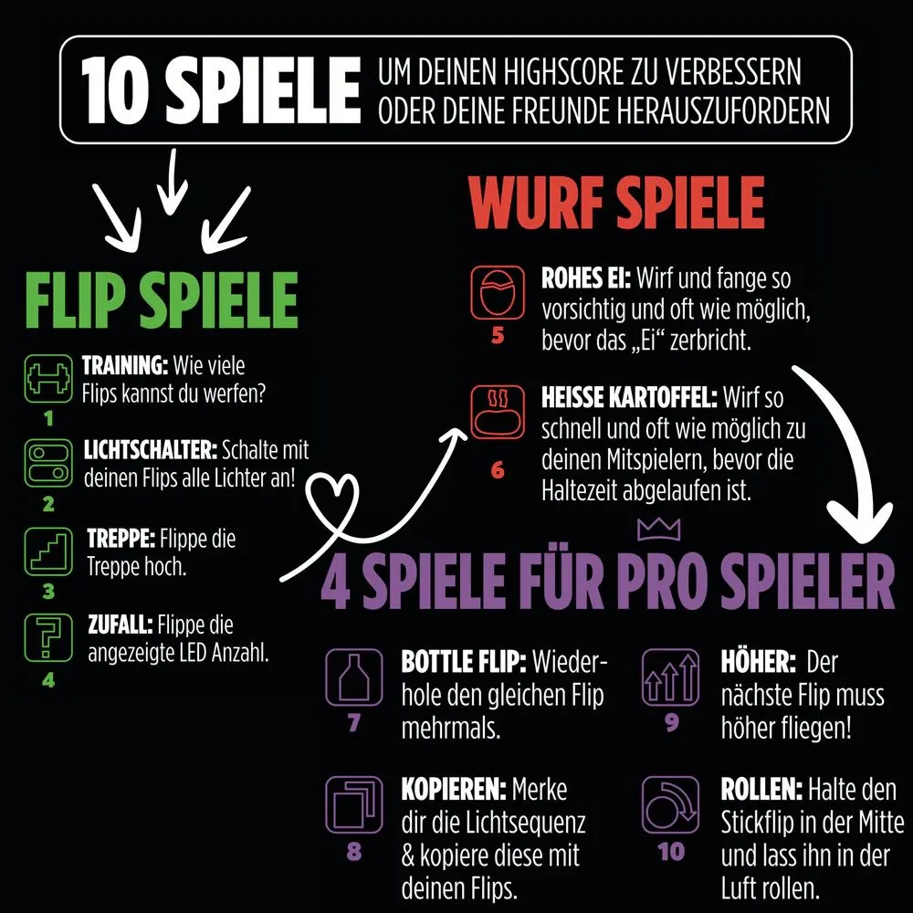 Stickflip vereint auf einzigartige Weise Bewegung, Spielspaß und technologische Faszination – ein echtes Highlight für Kinder, Teenager und alle jung gebliebenen Erwachsenen!