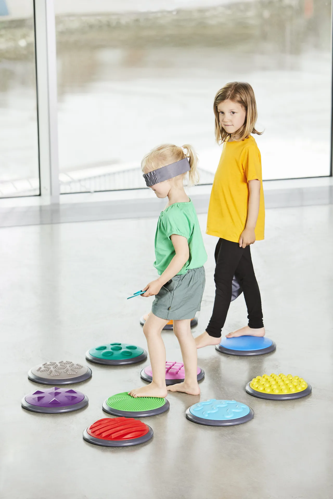 Wenn Sie eine besondere Herausforderung für Kinder oder Patienten kreieren möchten, können Sie die Augenbinde einsetzen. Wer das Muster der Scheiben mit den Händen ertastet oder darüberlaufen soll, muss sich auf den Tastsinn, die Konzentration und die Merkfähigkeit ohne visuelles Bild verlassen.