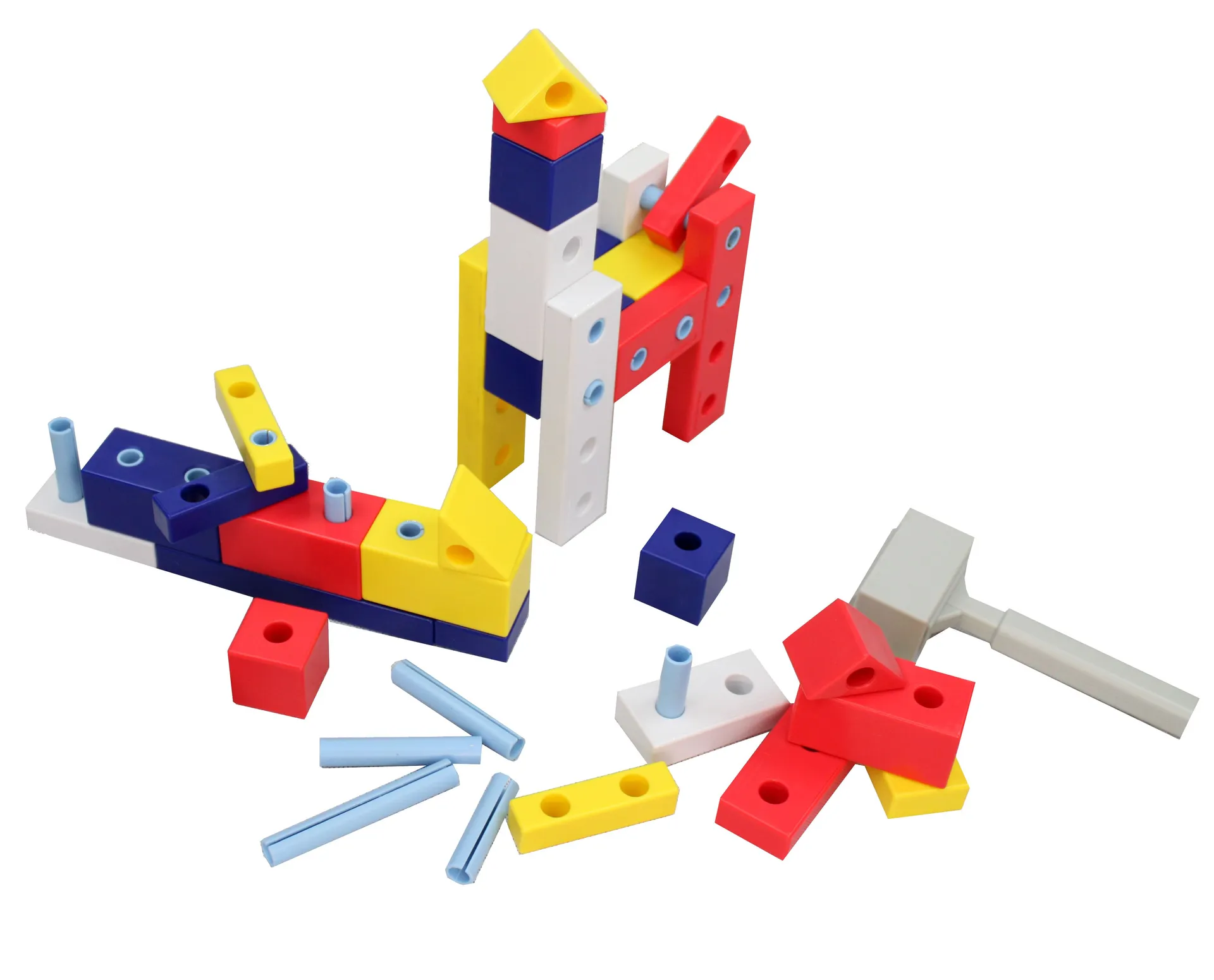 Das Konstruktionsspiel besteht aus 67 Bausteinen in verschiedenen Farben. 51 Verbindungsstücke, drei graue Hämmer und eine Gebrauchsanleitung runden das Spiel ab. Jedes Bauelement besteht aus Kunststoff. Die Hämmer sind jeweils 18 cm lang. Der Hammer dient als Unterstützung beim Bauen. Die Schrauben haben eine Länge von 6 cm sowie einen Durchmesser von 1 cm. Unter anderem aufgrund der vielen Einzelteile kommt das Spiel erst für Kinder ab drei Jahren infrage. Einsatzorte sind beispielsweise Kindertagesstätten oder der Schul- und Hortbereich. Dank der robusten Materialeigenschaften findet das Spiel sowohl im Außen- als auch im Innenbereich seine Verwendung.