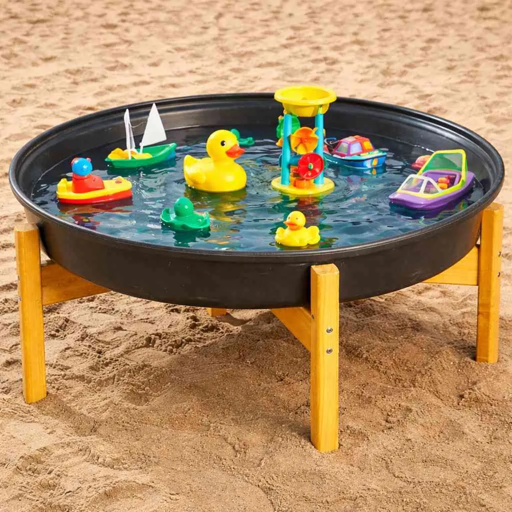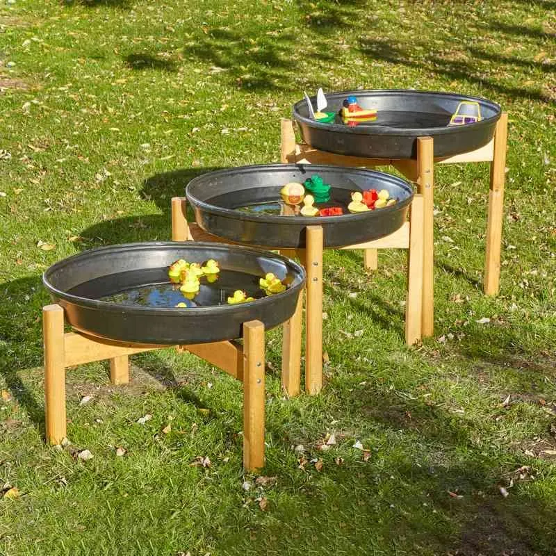 Durch die hintereinander aufstellbaren Wannen entsteht ein kaskadenartiges Wasserspiel, bei dem das Wasser von einer Ebene zur nächsten geleitet werden kann. So lassen sich fantasievolle Wasserläufe gestalten, kleine Flüsse anlegen oder Boote und Badeenten auf die Reise schicken. Das Wasserspiel eignet sich hervorragend für Experimente mit unterschiedlichen Wassermengen, Gefäßen oder Naturmaterialien wie Steinen, Blättern und Sand.