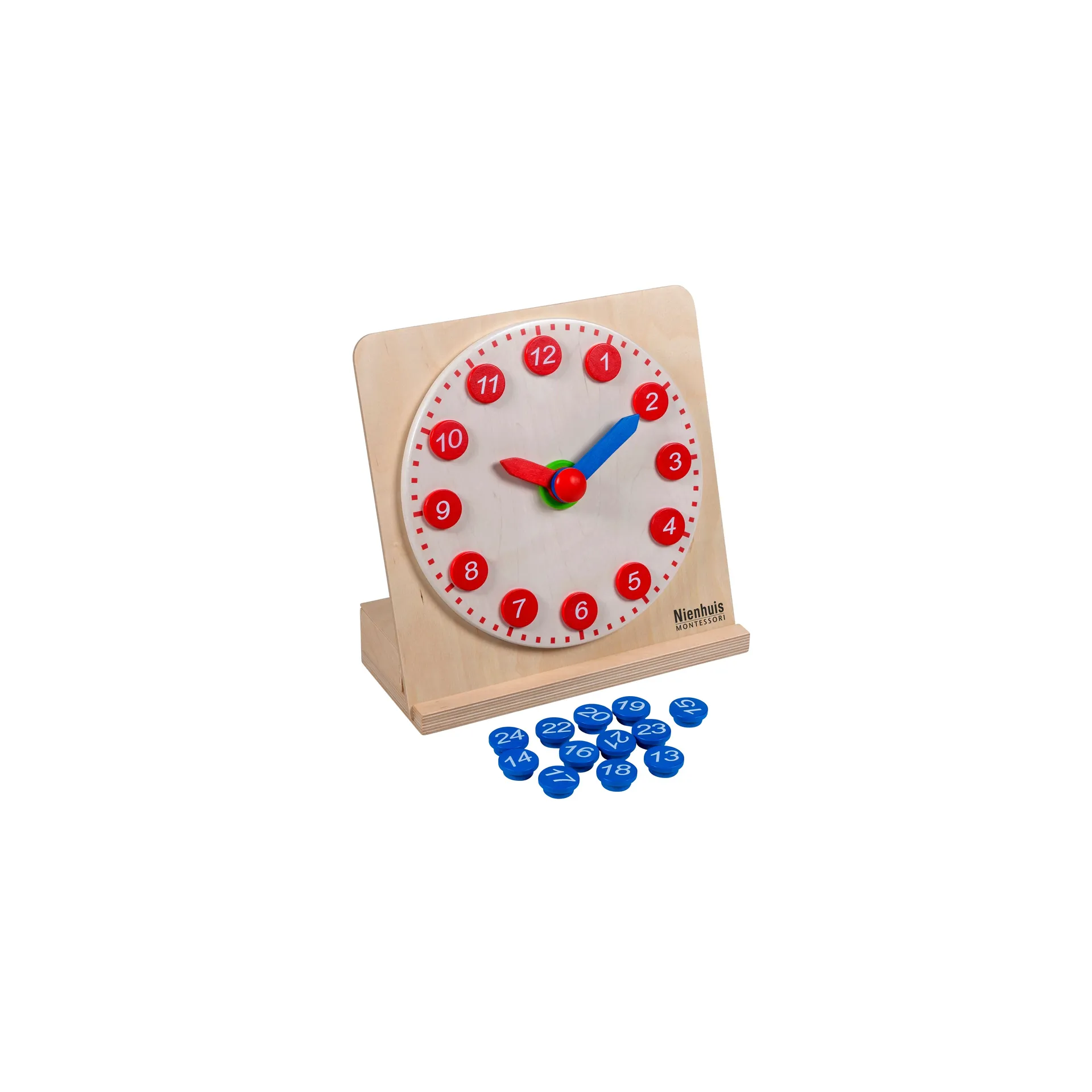 Die Ziffern-Lernuhr von Educo ist ein ideales Lehrmittel, um Kindern die Uhrzeit auf spielerische Weise beizubringen. Diese frei stehende Uhr verfügt über bewegliche Zeiger und abnehmbare Zahlen von 1 bis 12 in Rot und 13 bis 24 in Blau. So können Kinder sowohl das 12-Stunden- als auch das 24-Stunden-Zeitformat erlernen.