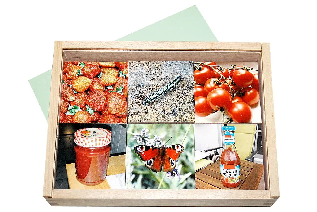 Bei diesem Spiel müssen sich die Kinder nicht nur die Paare merken wie beim normalen Memory, sondern erst einmal die Paare erraten. Dazu braucht es Logik und Wissen. Wer glaubt, aus der Raupe wird ein Frosch, muss bei den anderen Karten besser aufpassen. Insgesamt 36 Plättchen aus Holz mit einer Größe von je 7 x 7 cm ergeben 18 interessante Paarkonstellationen. Diese variieren von einfachen Verbindungen, wie einem Ei, das zum Küken wird, bis zu durchaus schwierigeren Varianten. Nicht jeder kennt Hagebutten und weiß, dass daraus Tee hergestellt wird.