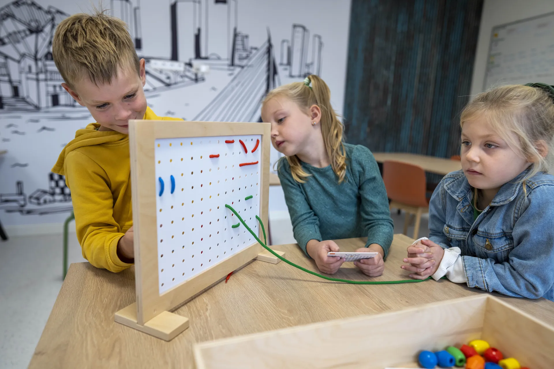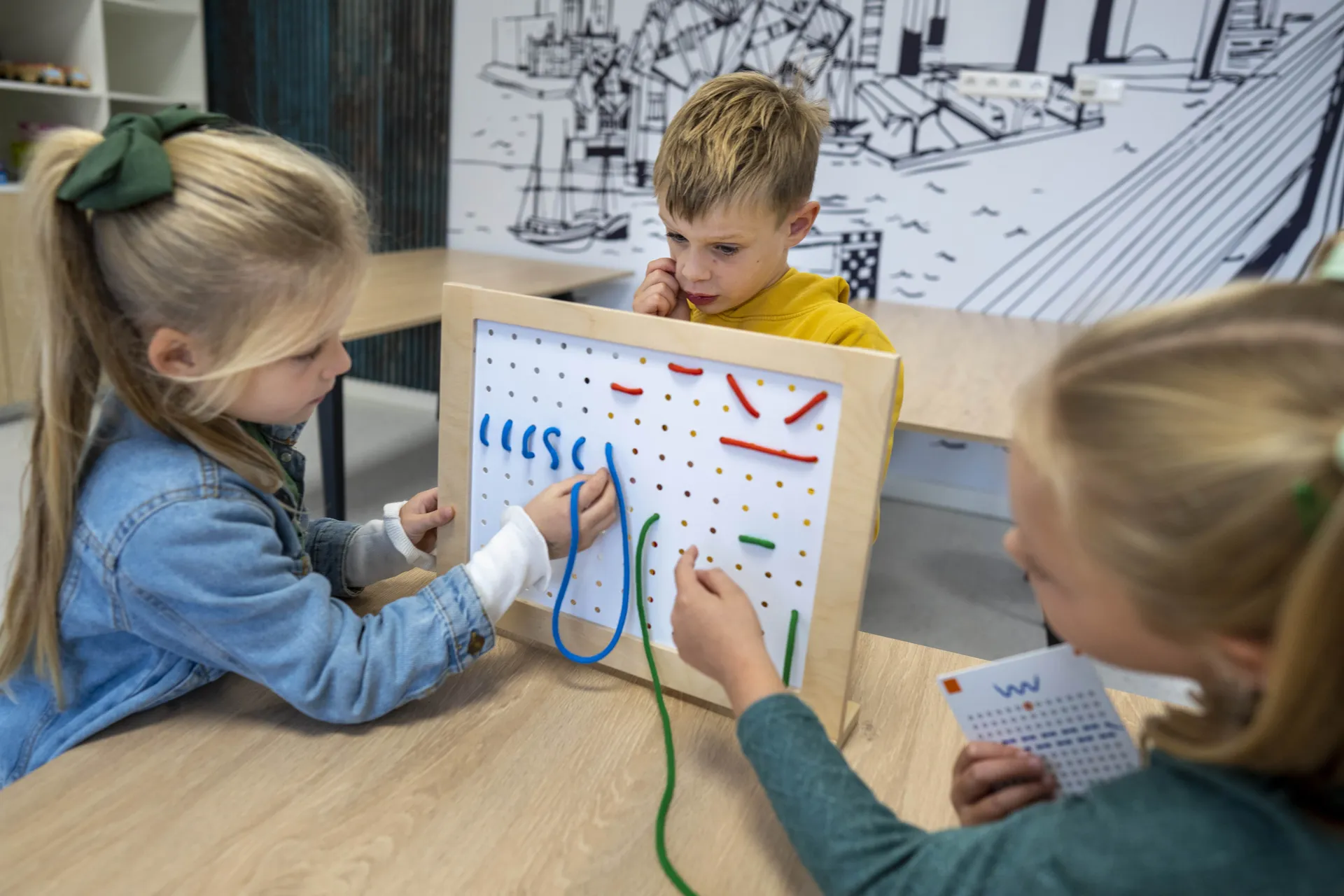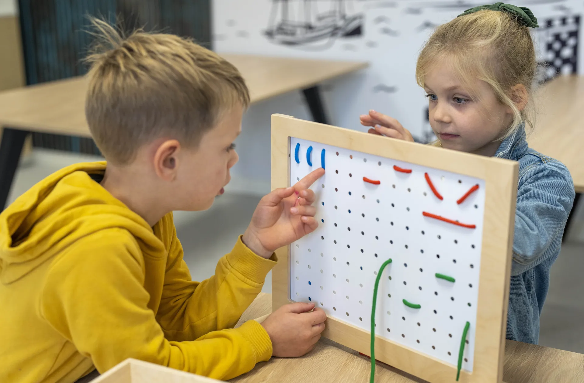 Die Kinder beginnen das Spiel, indem sie die Schnüre durch die Löcher im Brett fädeln. Sie können entweder den Abbildungskarten folgen, um vorgegebene Muster zu erstellen, oder ihrer Fantasie freien Lauf lassen und eigene Designs entwickeln. Durch das gemeinsame Fädeln lernen die Kinder, effektiv zu kommunizieren und zusammenzuarbeiten, um ein gemeinsames Ziel zu erreichen. Dieses interaktive Spiel fördert zudem die Feinmotorik und die Hand-Augen-Koordination.
