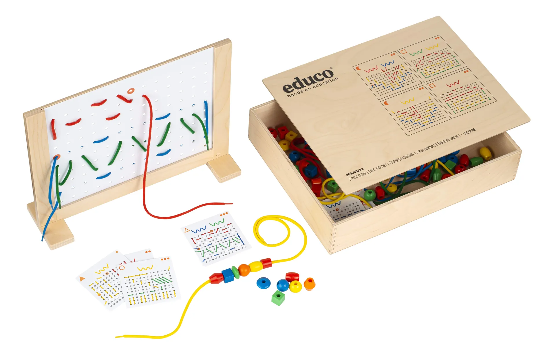 Das Fädelspiel "Zusammen schnüren" von Educo ist ein kreatives und lehrreiches Spielzeug, das speziell entwickelt wurde, um Kommunikation, Kreativität und Teamarbeit bei Kindern zu fördern. Dieses Spiel lädt Kinder ein, gemeinsam auf beiden Seiten des aufrechten Rahmens zu spielen, indem sie die Schnüre durch die Löcher im Brett fädeln und dabei entweder den Abbildungskarten folgen oder eigene Designs kreieren.
